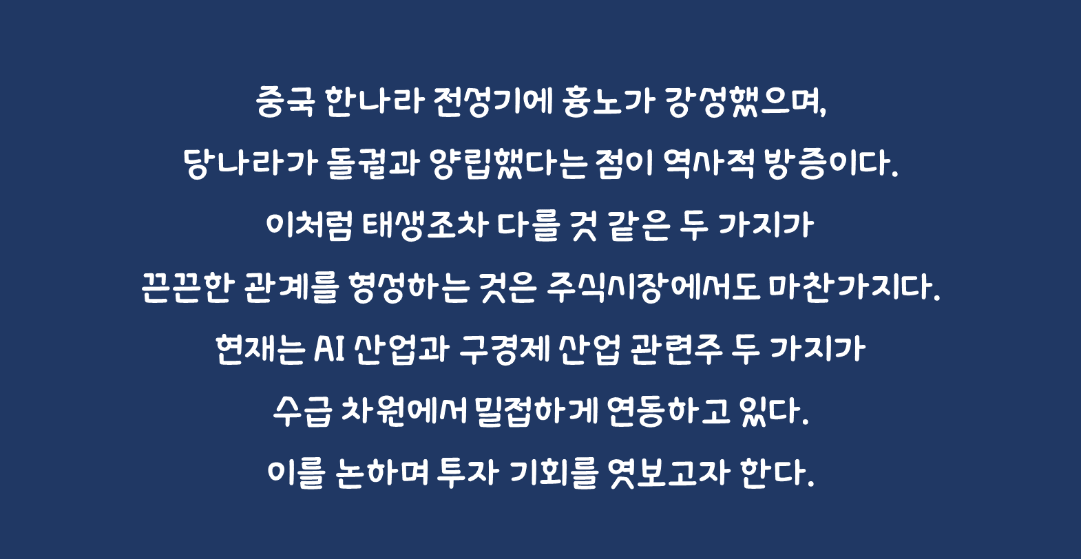 '위태로운 변경(The perious fronier)'의 저자 '토마스 바필드(Thomas J. Barield)'에 따르면, 중국의 중원에 자리 잡은 제국과 변방에 위치한 유목민족 사이에는 특별한 관계가 형성된다. 제국이 존재해야만 유목민족도 강력한 통일 체계를 갖출 수 있는 것이다. 제국의 막대한 물자가 이전(또는 수탈)될 때 비로소 유목민족이 기반을 다질 수 있기 때문이다. 중국 한나라 전성기에 흉노가 강성했으며, 당나라가 돌궐과 양립했다는 점이 역사적 방증이다. 이처럼 태생조차 다를 것 같은 두 가지가 끈끈한 관계를 형성하는 것은 주식시장에서도 마찬가지다. 현재는 AI 산업과 구경제 산업 관련주 두 가지가 수급 차원에서 밀접하게 연동하고 있다. 이를 논하며 투자 기회를 엿보고자 한다.