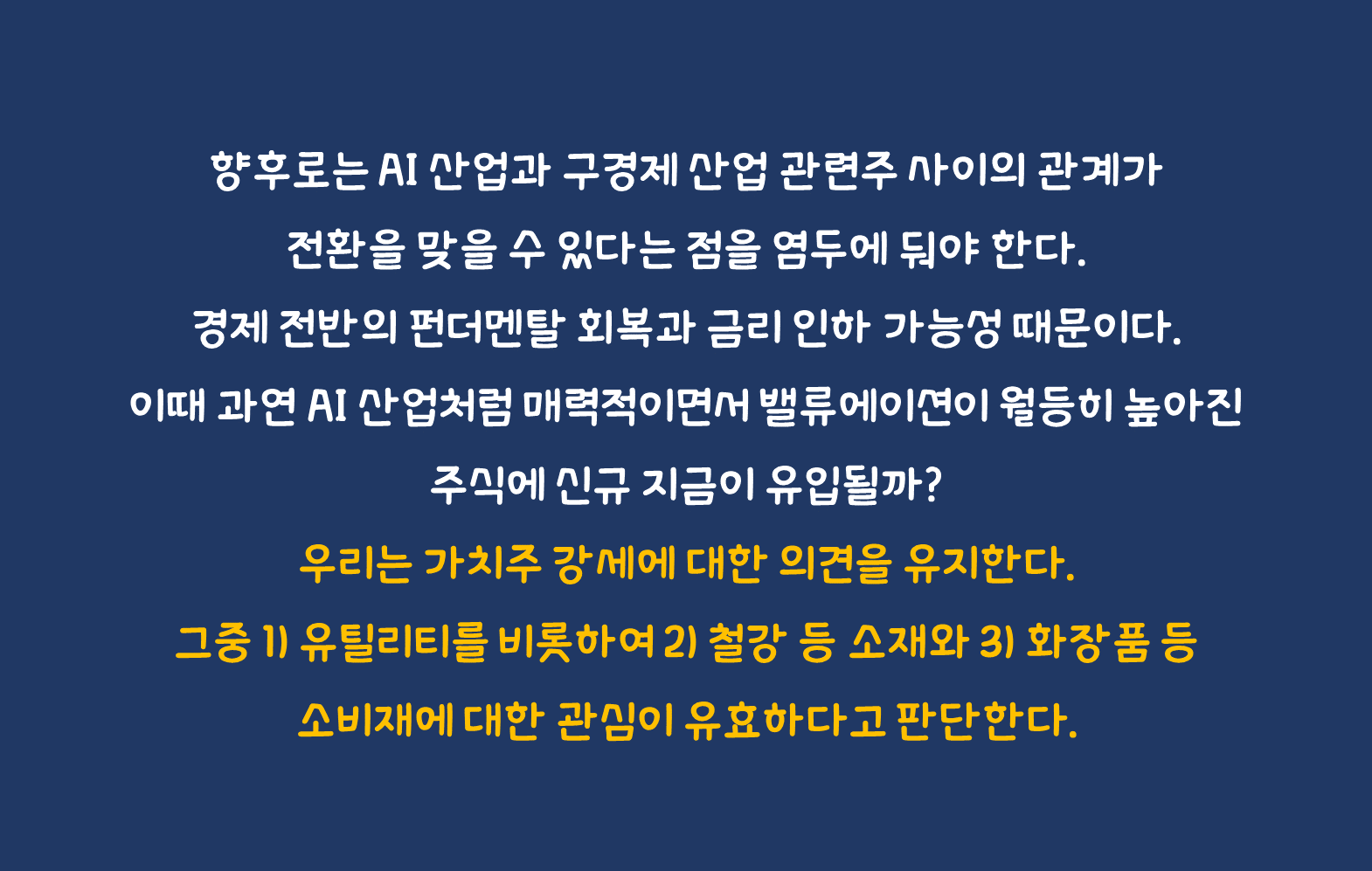 이때 과연 AI 산업처럼 매력적이면서 밸류에이션이 월등히 높아진 주식에 신규 지금이 유입될까? 아니면 구경제 등 AI 외 산업처럼 (펀더멘탈 회복에 의하여) 새롭게 매력이 부상하면서 밸류에이션이 현격히 낮아진 주식에 신규 자금이 유입될까? 그 답은 너무나 명확해 보인다. 우리는 가치주 강세에 대한 의견을 유지한다. 그중 1) 유틸리티를 비롯하여 2) 철강 등 소재와 3) 화장품 등 소비재에 대한 관심이 유효하다고 판단한다.