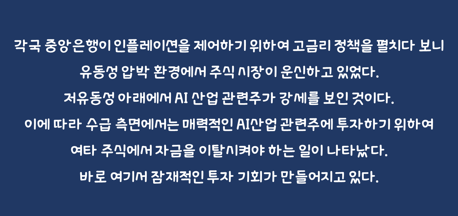 다만, 이와 같은 과정이 진행되며 주식시장의 수급 측면에서는 흥미로운 일이 발생했다. 직전까지 각국 중앙은행이 인플레이션을 제어하기 위하여 고금리 정책을 펼치다 보니 유동성 압박 환경에서 주식 시장이 운신하고 있었다. 저유동성 아래에서 AI 산업 관련주가 강세를 보인 것이다. 이에 따라 수급 측면에서는 매력적인 AI 산업 관련주에 투자하기 위하여 여타 주식에서 자금을 이탈시켜야 하는 일이 나타났다. 마치 제국을 수탈하며 유족민족이 떠오르는 것처럼 말이다. 바로 여기서 잠재적인 투자 기회가 만들어지고 있다.