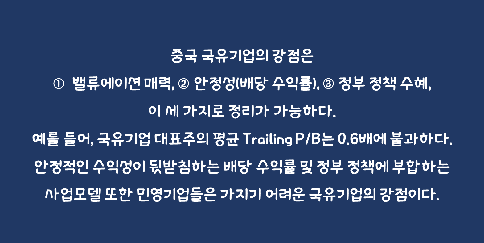 ✅국유기업 강점: ① 밸류에이션 매력, ② 안정성(배당 수익률), ③ 정부 정책 수혜