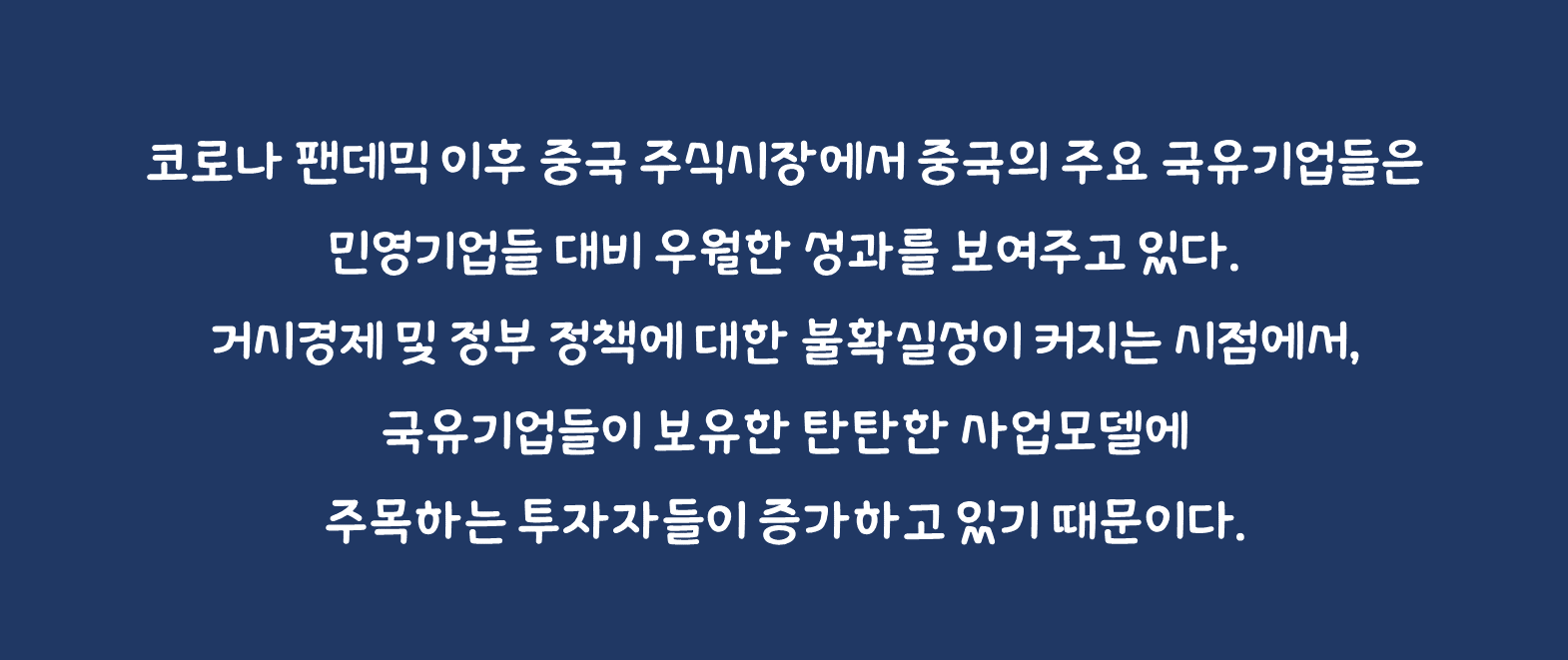 국유기업이란 중국 정부가 지배하는 공기업들을 의미한다. 코로나 팬데믹 이후 중국 주식시장에서 중국의 주요 국유기업들은 민영기업들 대비 우월한 성과를 보여주고 있다. 거시경제 및 정부 정책에 대한 불확실성이 커지는 시점에서, 국유기업들이 보유한 탄탄한 사업모델에 주목하는 투자자들이 증가하고 있기 때문이다.