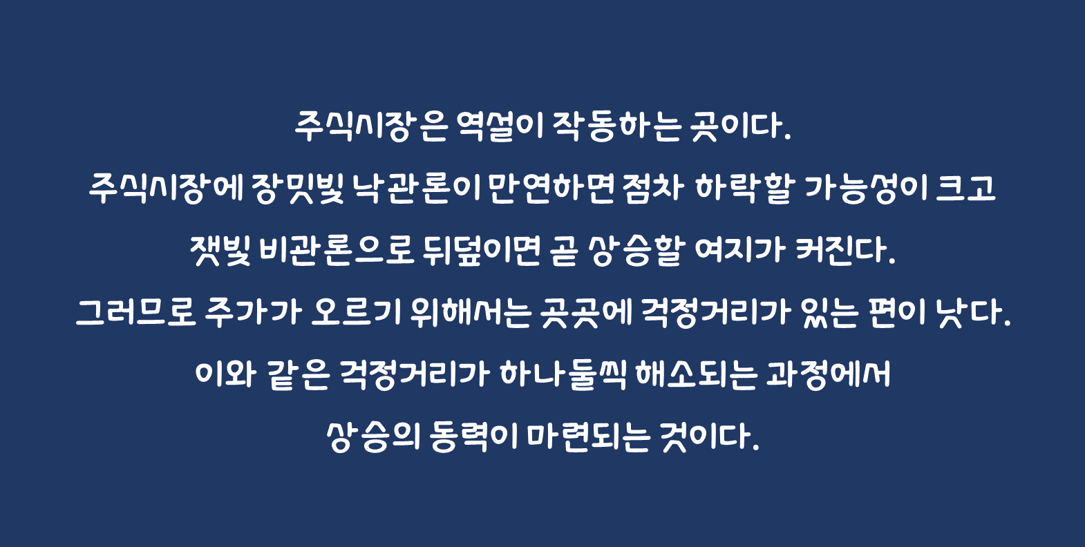주식시장은 역설이 작동하는 곳이다. 주식시장에 장밋빛 낙관론이 만연하면 점차 하락할 가능성이 크고 잿빛 비관론으로 뒤덮이면 곧 상승할 여지가 커진다. 그러므로 주가가 오르기 위해서는 곳곳에 걱정거리가 있는 편이 낫다. 이와 같은 걱정거리가 하나둘씩 해소되는 과정에서 상승의 동력이 마련되는 것이다. 걱정의 관점에서 보면 향후 주식시장은 추가 상승할 수 있다고 판단한다.