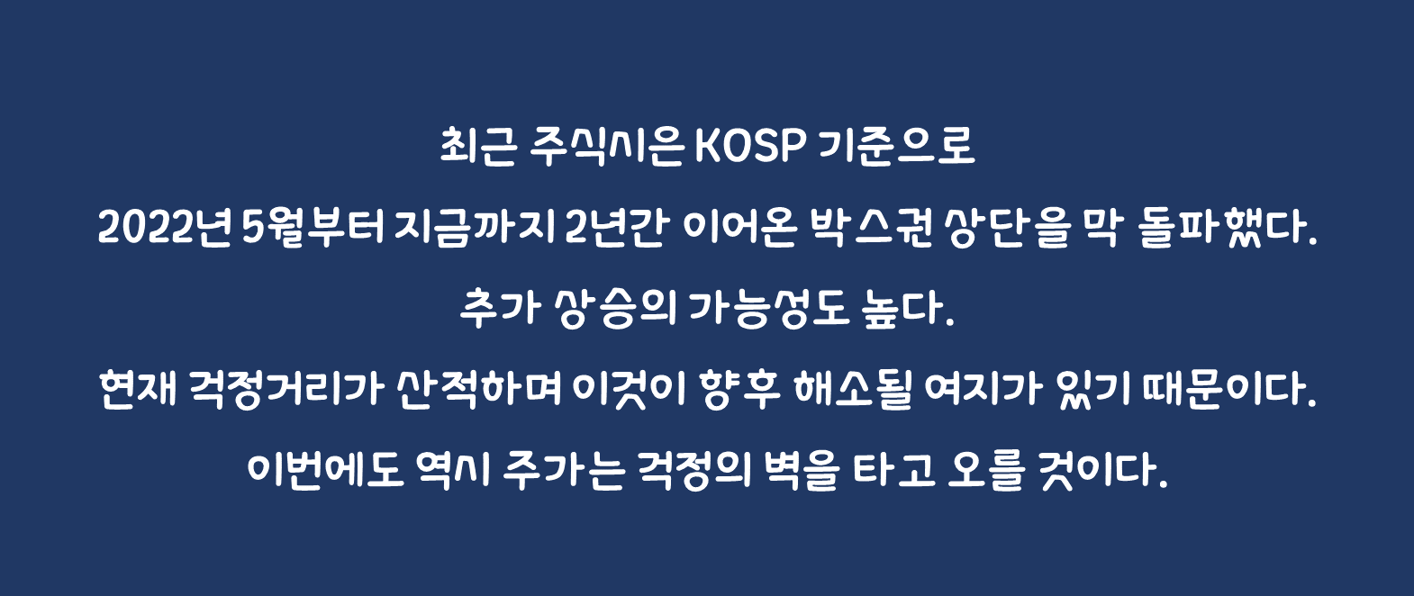 최근 주식시장은 KOSP 기준으로 2022년 5월부터 지금까지 2년간 이어온 박스권 상단을 막 돌파했다. 추가 상승의 가능성도 높다. 현재 걱정거리가 산적하며 이것이 향후 해소될 여지가 있기 때문이다. 이번에도 역시 주가는 걱정의 벽을 타고 오를 것이다.