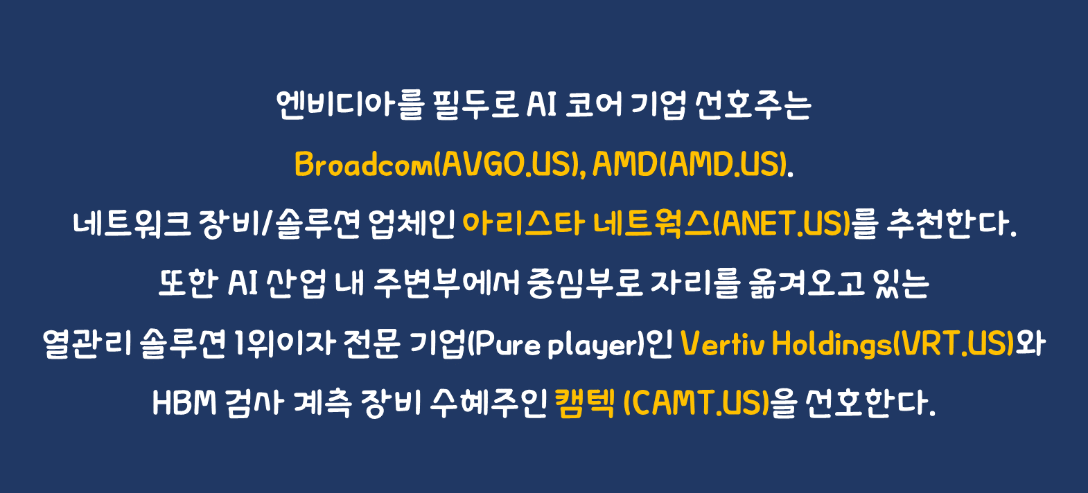 엔비디아를 필두로 AI 코어 기업 선호주는 Broadcom(AVGO.US), AMD(AMD.US). 네트워크 장비/솔루션 업체인 아리스타 네트웍스(ANET.US)를 추천한다. 또한 AI 산업 내 주변부에서 중심부로 자리를 옮겨오고 있는 열관리 솔루션 1위이자 전문 기업(Pure player)인 Vertiv Holdings(VRT.US)와 HBM 검사 계측 장비 수혜주인 캠텍 (CAMT.US)을 선호한다.