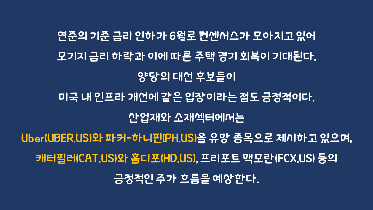 연준의 기준 금리 인하가 6월로 컨센서스가 모아지고 있어 모기지 금리 하락과 이에 따른 주택 경기 회복이 기대된다. 양당의 대선 후보들이 미국 내 인프라 개선에 같은 입장이라는 점도 긍정적이다. 아직은 30년 모기지 금리가 7% 수준으로 여전히 높고, 주택 거래는 바닥권이나 관련 기업의 주가는 먼저 움직이고 있다. 실적 면에서는 볼륨 증가에 주목할 필요가 있다. 디스인플레이션 환경에서 가격 인상이 제한적이므로 볼륨 증가가 중요해졌고, 비용 절감을 통한 이익 개선도 주목할 부분이다. 최근 구리 가격이 강세를 보이고 있어 소재산업에 대한 기대도 있다. 다만, 구리 가격의 상승이 제련수수료(TC) 하락에 따른 중국 제련소의 감산에 기인한다는 점에서 수요 측 요인이 아쉽다. 소재산업의 경우 가격 결정력이 중국에 있어 중국의 경기 회복이 관건이다. 산업재와 소재섹터에서는 Uber(UBER.US)와 파커-하니핀(PH.US)을 유망 종목으로 제시하고 있으며, 캐터필러(CAT.US)와 홈디포(HD.US), 프리포트 맥모란(FCX.US) 등의 긍정적인 주가 흐름을 예상한다.