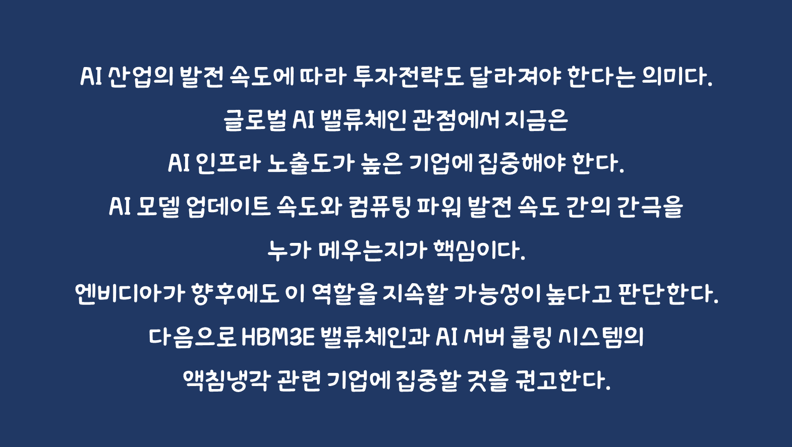 AI Super Cycle은 이제 초입 구간으로 주가의 기울기는 2024~2025년에 가장 가파를 것으로 전망한다. 초기에는 HW 인프라 기업이, 중기에는 SW 미들웨어 기업이, 후기에는 Application Layer, 콘텐츠 분야에서 수익화에 성공한 기업이 그 과실을 가져갈 것으로 판단한다. AI 산업의 발전 속도에 따라 투자전략도 달라져야 한다는 의미다. 글로벌 AI 밸류체인 관점에서 지금은 AI 인프라 노출도가 높은 기업에 집중해야 한다. AI 모델 업데이트 속도와 컴퓨팅 파워 발전 속도 간의 간극을 누가 메우는지가 핵심이다. 엔비디아가 향후에도 이 역할을 지속할 가능성이 높다고 판단한다. 엔비디아의 범용 AI 반도체 GPU, H100이 주도하고 있는 현재 시장과 주가 퍼포먼스만 보아도 그렇다. 다음으로 HBM3E 밸류체인과 AI 서버 쿨링 시스템의 액침냉각 관련 기업에 집중할 것을 권고한다. 엔비디아와 AMD의 가장 큰 성능 차이는 결국 메모리에서 나온다. HBM3E의 양산과 수율이 향후 엔비디아 밸류체인에 있어 핵심 역할을 수행할 것이다.