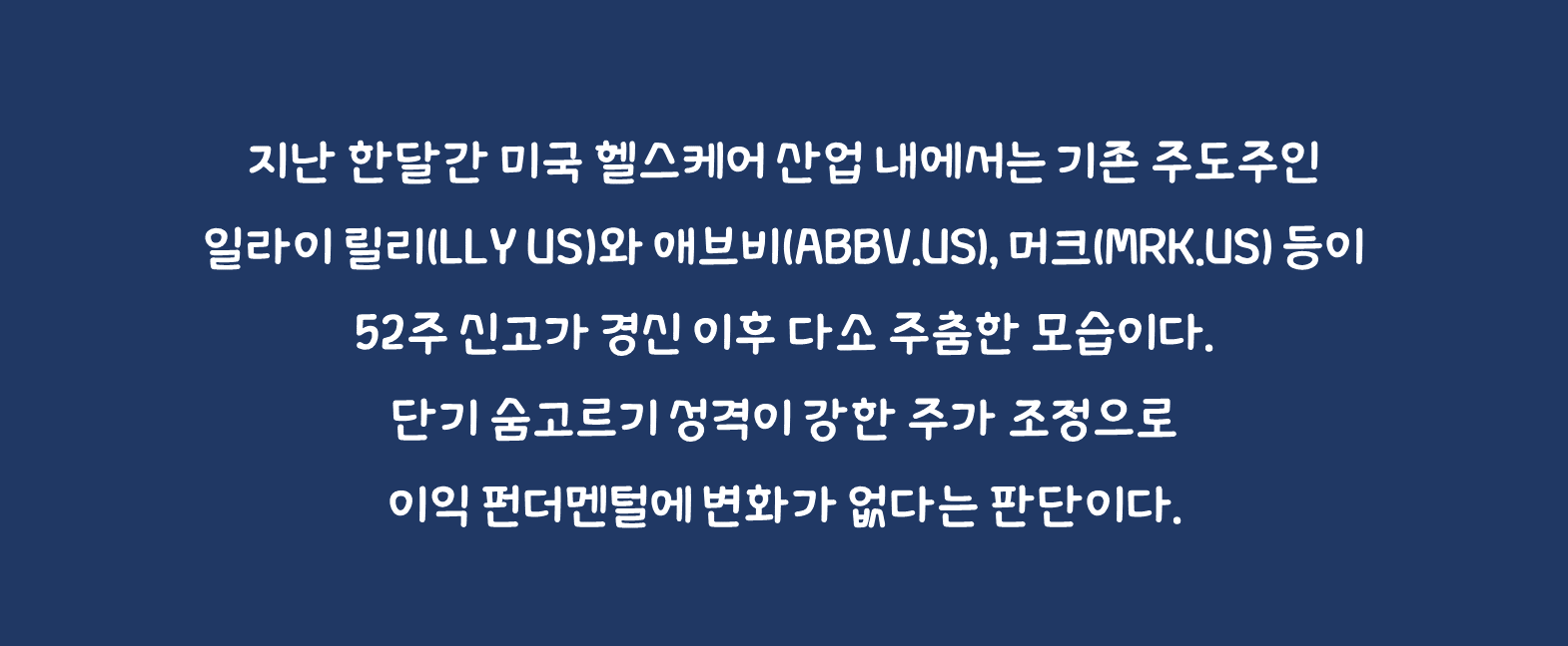 지난 한달간 미국 헬스케어 산업 내에서는 기존 주도주인 일라이 릴리(LLY US)와 애브비(ABBV.US), 머크(MRK.US) 등이 52주 신고가 경신 이후 다소 주춤한 모습이다. 단기 숨고르기 성격이 강한 주가 조정으로 이익 펀더멘털에 변화가 없다는 판단이다. 블록 버스터 신약 기대감과 파이프라인 유무에 따라 제약바이오 업계 내 주가 양극화가 지속되고 있는 만큼 개별 기업 모멘텀이 여전히 핵심 추가 드라이버로 작용하고 있다. 이에 모운자로(당뇨 치료제)와 젭바운드(비만 치료제)를 바탕으로 강력한 프로덕트 사이클이 지속되고 있는 일라이 릴리의 추가적인 업사이드를 전망한다. 머크의 경우 키트루다 및 가다실 모멘텀과 더불어 소타터센트(폐동맥 고혈압 치료제) 기대감이 긍정적이다. 한편 인튜이티브 서지컬(ISRG.US)과 Dexcom(DXCM.US) 등 일부 메디컬 디바이스 업체의 주가 오름세가 이어지고 있다. 이는 FDA의 신제품 승인 등 호재가 반영된 결과로 인튜 이티브 서지컬은 다빈치 5, Dexcom은 OTC용 연속혈당측정기(CGM)가 최근 사용 허가되었다.