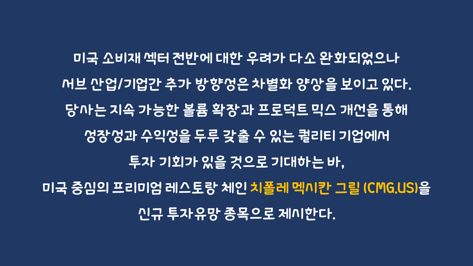 최근 미국 소매 판매(2월 +0.6%)와 소비자 지출(CNBC/NRF Retall Monitor, 2월 +1.06% (자동차, 유류비 제외)) 데이터 등이 양호하게 발표되면서 미국 소비재 섹터 전반에 대한 우려가 다소 완화되었으나 서브 산업/기업간 추가 방향성은 차별화 양상을 보이고 있다. 필수소비재 성격의 월마트, 타깃, 크로거 등 리테일 유통산업 대표 기업들의 주가가 우상향 흐름을 보이고 있는 반면 테슬라, 나이키 등은 경쟁 심화와 수요 환경에 대한 부정적인 시각이 발목을 잡고 있다. 당사는 지속 가능한 볼륨 확장과 프로덕트 믹스 개선을 통해 성장성과 수익성을 두루 갖출 수 있는 퀄리티 기업에서 투자 기회가 있을 것으로 기대하는 바, 미국 중심의 프리미엄 레스토랑 체인 치폴레 멕시칸 그릴 (CMG.US)을 신규 투자유망 종목으로 제시한다.