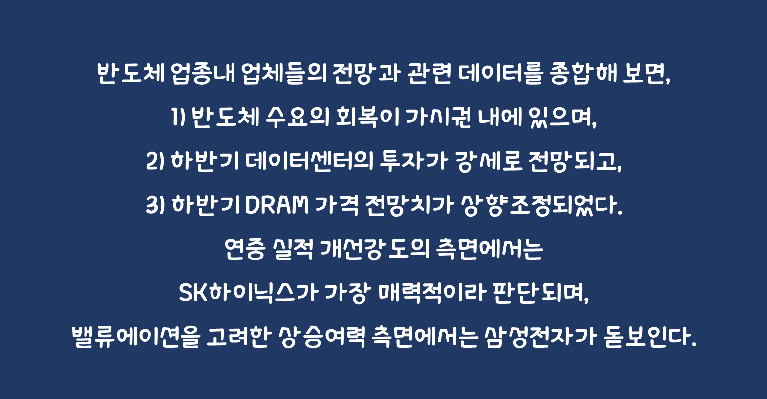 반도체 업종내 업체들의 전망과 관련 데이터를 종합해 보면, 1) 반도체 수요의 회복이 가시권 내에 있으며, 2) 하반기 데이터센터의 투자가 강세로 전망되고, 3) 하반기 DRAM 가격 전망치가 상향조정되었다. 상기 내용으로부터 삼성전자, SK하이닉스의 24F 추정 영업이익을 각 +6%/+20% 상향하며, 목표가를 각 11만원/24만원으로 상향한다. 연중 실적 개선강도의 측면에서는 SK하이닉스가 가장 매력적이라 판단되며, 밸류에이션을 고려한 상승여력 측면에서는 삼성전자가 돋보인다.