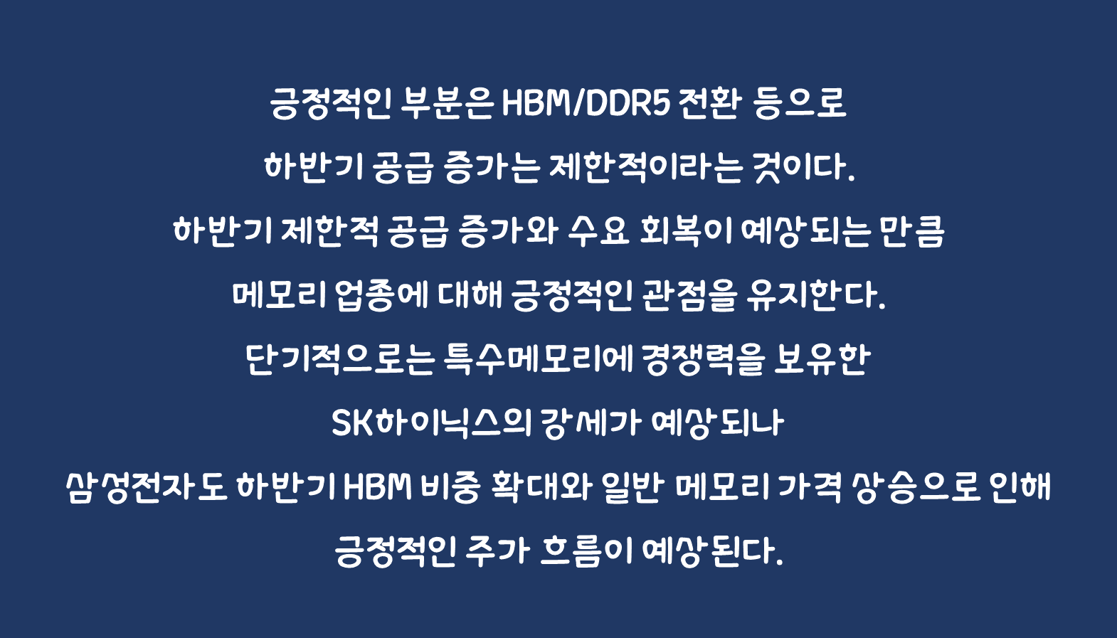 하반기 제한적 공급 증가와 수요 회복이 예상되는 만큼 메모리 업종에 대해 긍정적인 관점을 유지한다. 단기적으로는 특수메모리에 경쟁력을 보유한 SK하이닉스의 강세가 예상되나 삼성전자도 하반기 HBM 비중 확대와 일반 메모리 가격 상승으로 인해 긍정적인 주가 흐름이 예상된다.