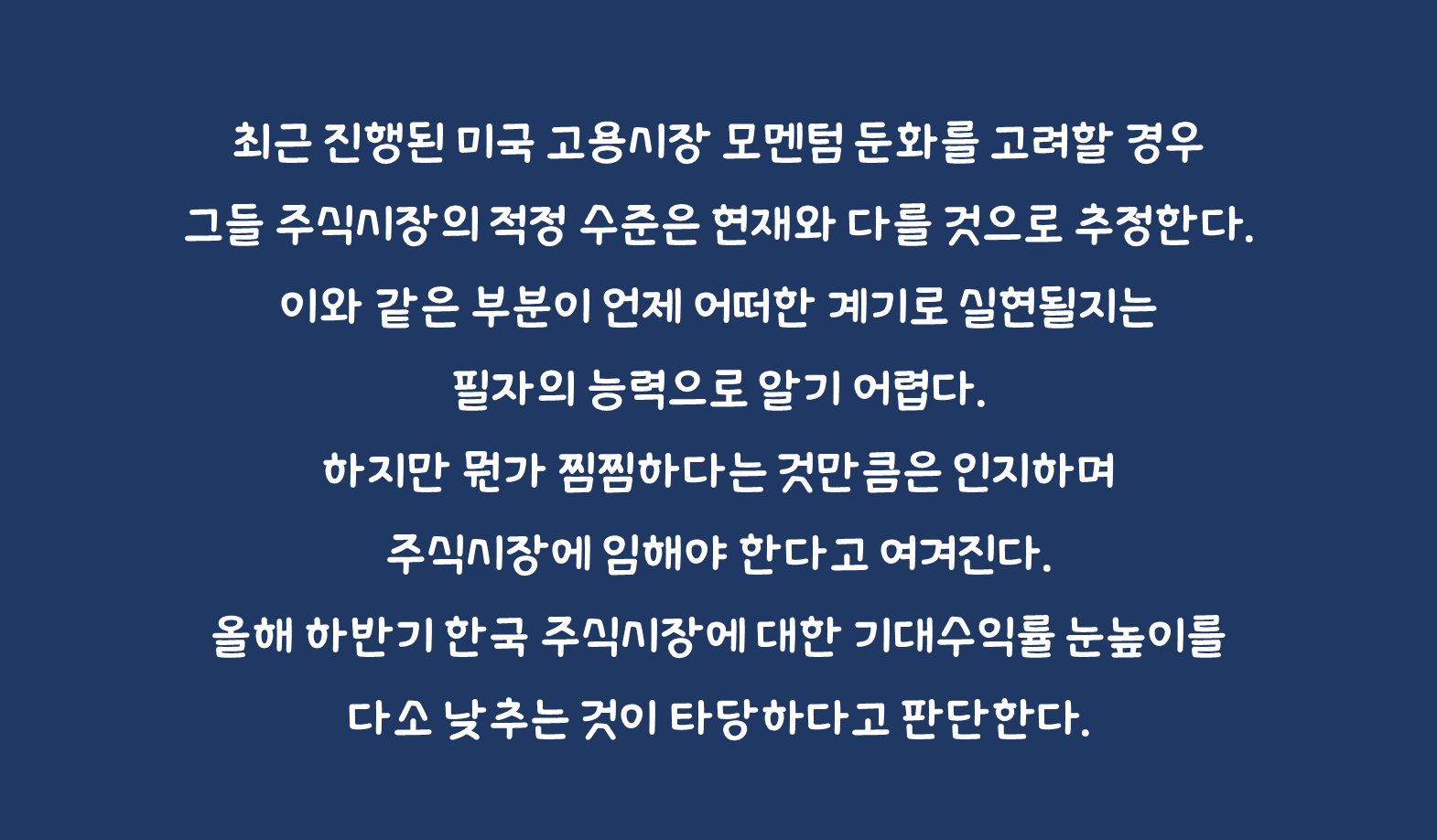 과거 사례를 보면 미국의 실업률이 자연실업률보다 양호한 상황에서도 그 모멘텀이 둔화하면 이에 맞춰 미국 주식시장이 반응해 왔다. 최근 진행된 미국 고용시장 모멘텀 둔화를 고려할 경우 그들 주식시장의 적정 수준은 현재와 다를 것으로 추정한다. 이와 같은 부분이 언제 어떠한 계기로 실현될지는 필자의 능력으로 알기 어렵다. 하지만 뭔가 찜찜하다는 것만큼은 인지하며 주식시장에 임해야 한다고 여겨진다. 올해 하반기 한국 주식시장에 대한 기대수익률 눈높이를 다소 낮추는 것이 타당하다고 판단한다.
