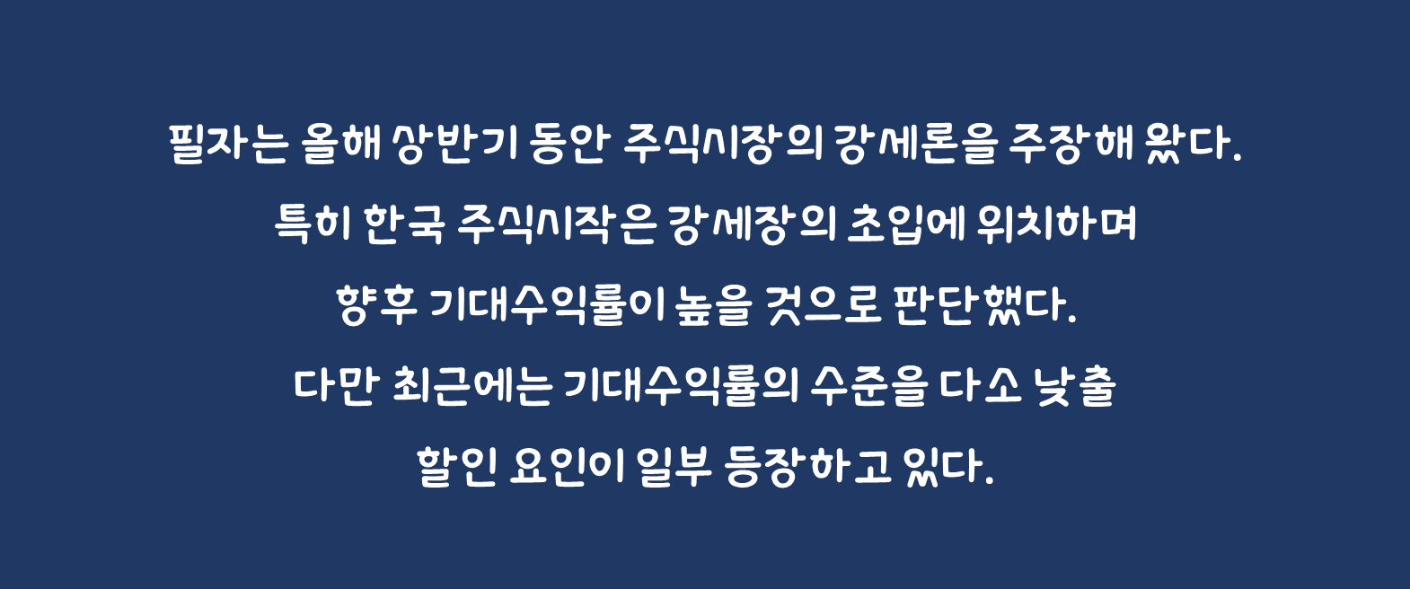 필자는 올해 상반기 동안 주식시장의 강세론을 주장해 왔다. 특히 한국 주식시작은 강세장의 초입에 위치하며 향후 기대수익률이 높을 것으로 판단했다. 다만 최근에는 기대수익률의 수준을 다소 낮출 할인 요인이 일부 등장하고 있다. 금일 본고에서는 이를 논하고자 한다.