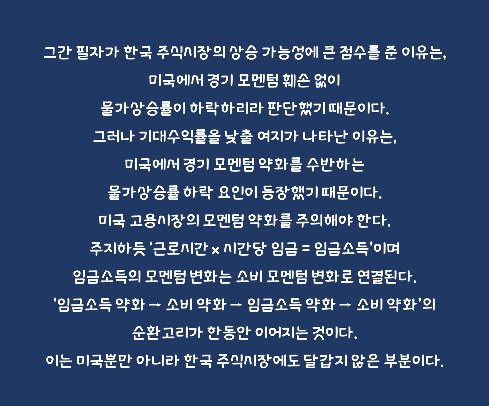 그러나 최근 한국 주식시장 기대수익률을 낮출 여지가 나타난 이유는, 미국에서 경기 모멘텀 약화를 수반하는 물가상승률 하락 요인이 등장했기 때문이다. 미국 고용시장의 모멘텀 약화를 주의해야 한다. 미국 고용시장의 타이트함에 대한 정도를 파악할 수 있는 구인/구직 비율은 최근 수년간 최대 2에서 현재 1.3으로 낮아졌다. 아직도 해당 비율이 1을 넘고 있기에 미국 고용시장이 견조한 것은 맞지만 모멘텀이 둔화한 것이다. 미국 고용시장 내부를 살펴보면 평균 근로시간과 평균 시간당 임금 증가율이 함께 낮아지고 있다. 주지하듯 '근로시간 x 시간당 임금 = 임금소득'이며 임금소득의 모멘텀 변화는 소비 모멘텀 변화로 연결된다. 더욱이 미국과 같은 경제 구조는 임금소득과 소비 사이에서 양성 피드백(자기 강화)이 작용한다. '임금소득 약화 → 소비 약화 → 임금소득 약화 → 소비 약화'의 순환고리가 한동안 이어지는 것이다. 이는 미국뿐만 아니라 한국 주식시장에도 달갑지 않은 부분이다.