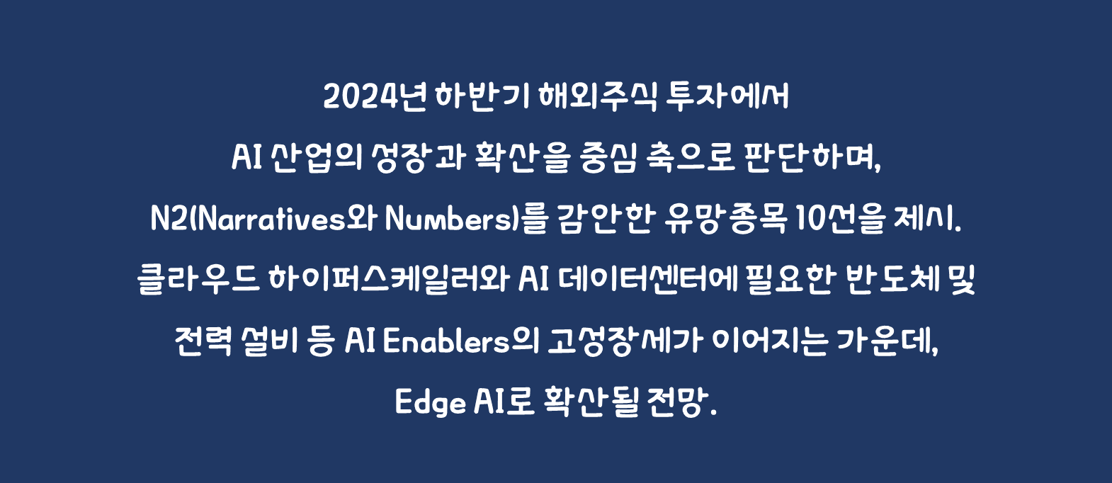 2024년 하반기 해외주식 투자에서 AI 산업의 성장과 확산을 중심 축으로 판단하며, N2(Narratives와 Numbers)를 감안한 유망종목 10선을 제시. 클라우드 하이퍼스케일러와 AI 데이터센터에 필요한 반도체 및 전력 설비 등 AI Enablers의 고성장세가 이어지는 가운데, Edge AI로 확산될 전망. 일본은 금융정책 정상화와 경제 성장 전망 속에 정책 수혜주 모멘텀이 예상되며, 중국은 지나친 경기 낙관론을 경계하며 백마주(白馬股, 대형 우량주) 중심의 투자 전략 권고.