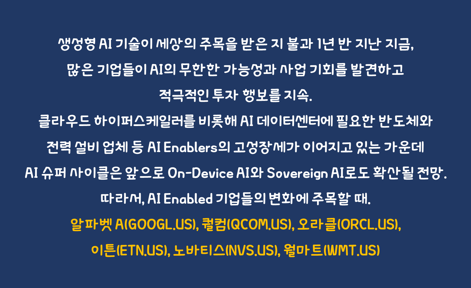 생성형 AI 기술이 세상의 주목을 받은 지 불과 1년 반 지난 지금, 많은 기업들이 AI의 무한한 가능성과 사업 기회를 발견하고 적극적인 투자 행보를 지속. 클라우드 하이퍼스케일러를 비롯해 AI 데이터센터에 필요한 반도체와 전력 설비 업체 등 AI Enablers의 고성장세가 이어지고 있는 가운데 AI 슈퍼 사이클은 앞으로 On-Device AI와 Sovereign AI로도 확산될 전망. 산업, 기업 단에서는 생성형 AI 에이전트 등을 활용해 효율화와 혁신을 만들어가는 초기 단계. AI의 적용은 실로 많은 분야에서 효율성을 높이고 새로운 가능성을 열어주며 혁신을 주도. 리테일 업계에서는 고객 경험뿐만 아니라 직원 및 관리 역량을 강화. 제약, 바이오 산업에서는 AI 기반 R&D 역량 강화를 통해 신약 개발의 성과를 기대. 따라서, AI Enabled 기업들의 변화에 주목할 때.