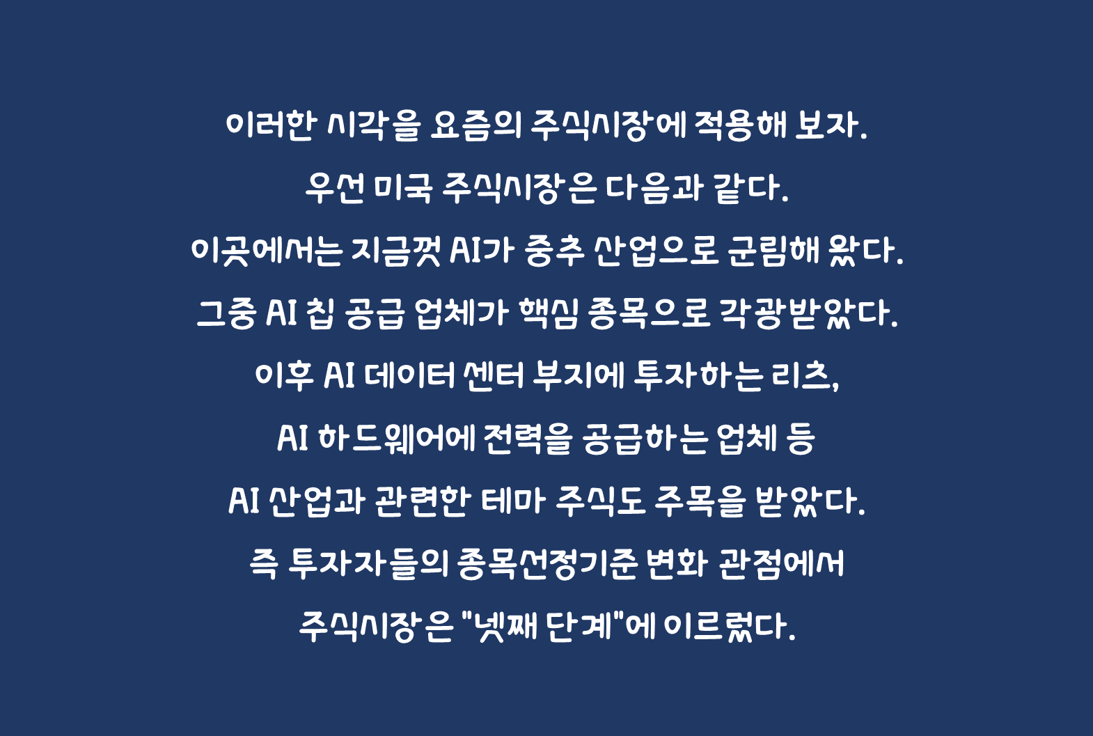 이러한 시각을 요즘의 주식시장에 적용해 보자. 우선 미국 주식시장은 다음과 같다. 이곳에서는 지금껏 AI가 중추 산업으로 군림해 왔다. 그중 AI 칩 공급 업체가 핵심 종목으로 각광받았다. 이후 AI 데이터 센터 부지에 투자하는 리츠, AI 하드웨어에 전력을 공급하는 업체 등 AI 산업과 관련한 테마 주식도 주목을 받았다. 한국 주식시장 역시 유사한 형태를 보였다. AI 칩에 포함되는 고대역 메모리 생산 업체가 핵심 종목으로 투자자의 이목을 끌었다. 또한 AI 관련 테마가 일부 형성됐음은 물론이다. 즉 투자자들의 종목선정기준 변화 관점에서 주식시장은 "넷째 단계"에 이르렀다.