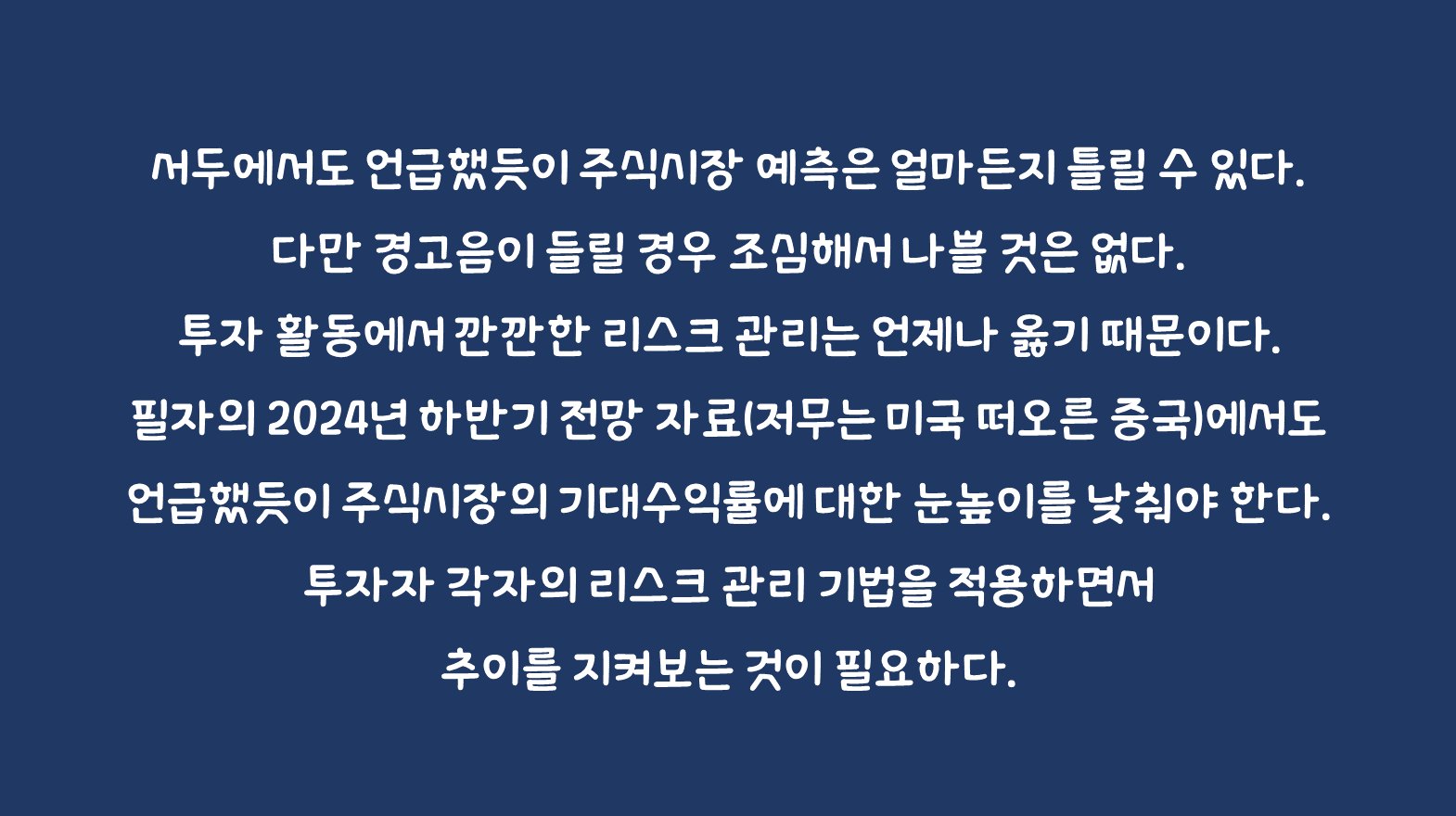 서두에서도 언급했듯이 주식시장 예측은 얼마든지 틀릴 수 있다. 다만 경고음이 들릴 경우 조심해서 나쁠 것은 없다. 투자 활동에서 깐깐한 리스크 관리는 언제나 옳기 때문이다. 책 얘기가 나왔으니 하나만 더 얘기하고 싶다. 당대의 대가들과 인터뷰한 것을 정리한 「시장의 마법사들 (잭 슈웨거 저)」 시리즈는 인기 높은 투자 서적이다. 하지만 이에 등장하는 화려한 주인공 중에서 리스크 관리 실패로 지금은 투자 활동을 중단한 인물들이 있다는 것은 우리에게 경각심을 불러일으킨다. 필자의 2024년 하반기 전망 자료(저무는 미국 떠오른 중국)에서도 언급했듯이 주식시장의 기대수익률에 대한 눈높이를 낮춰야 한다. 투자자 각자의 리스크 관리 기법을 적용하면서 추이를 지켜보는 것이 필요하다. 모두가 알고 있듯이 차후 좋은 기회는 얼마든지 있다. 현재 투자 난이도가 올라가는 환경에서 구태여 무리할 필요는 없다.