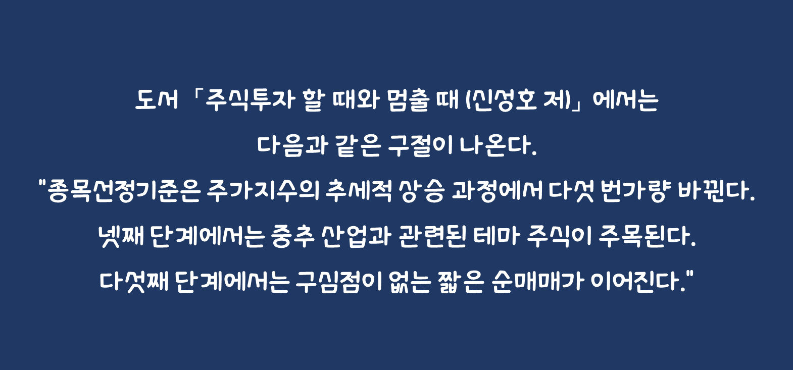 도서 「주식투자 할 때와 멈출 때 (신성호 저)」에서는 다음과 같은 구절이 나온다. "종목선정기준은 주가지수의 추세적 상승 과정에서 다섯 번가량 바뀐다. 첫째 단계에서는 직전의 장기간 하락 여파 때문에 방어적이다. 둘째 단계에서는 상대적으로 낮은 PER 종목이 중시된다. 셋째 단계에서는 우리 경제를 이끄는 중추 산업 내의 핵심 종목이 주목된다. 넷째 단계에서는 중추 산업과 관련된 테마 주식이 주목된다. 다섯째 단계에서는 구심점이 없는 짧은 순매매가 이어진다." 일련의 변화 과정을 거치며 주 식시장의 상승이 마무리되는 것이다.
