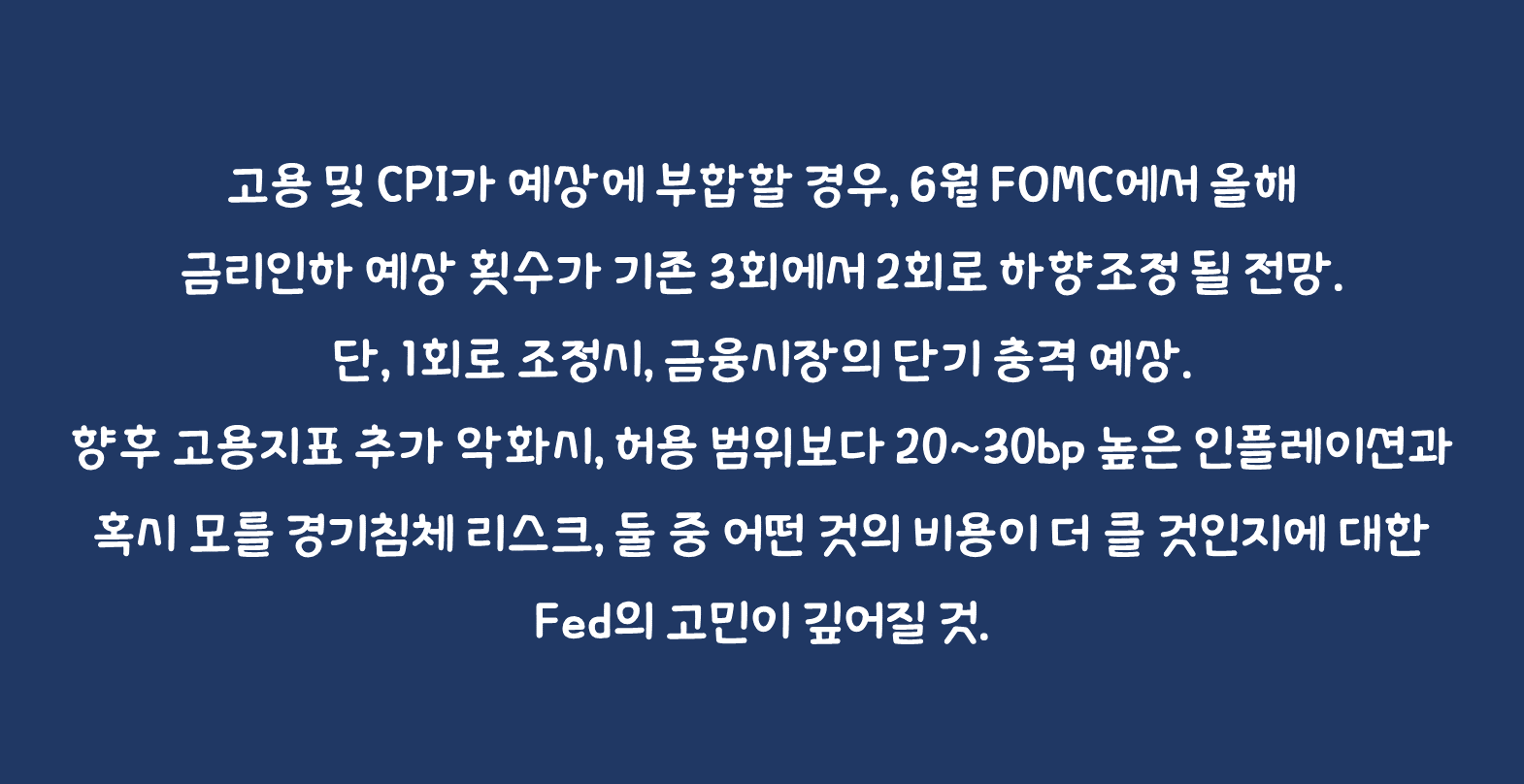 ✅고용 및 CPI가 예상에 부합할 경우, 6월 FOMC에서 올해 금리인하 예상 횟수가 기존 3회에서 2회로 하향조정 될 전망. 단, 1회로 조정시, 금융시장의 단기 충격 예상.