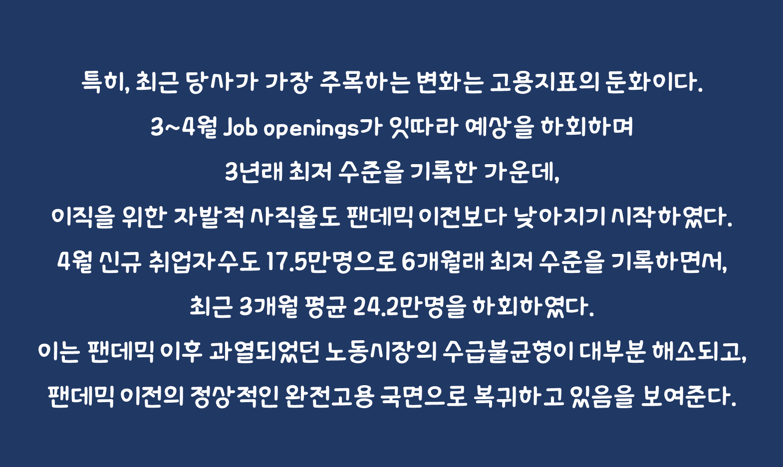 ✅향후 고용지표 추가 악화시, 허용 범위보다 20~30bp 높은 인플레이션과 혹시 모를 경기침체 리스크, 둘 중 어떤 것의 비용이 더 클 것인지에 대한 Fed의 고민이 깊어질 것.