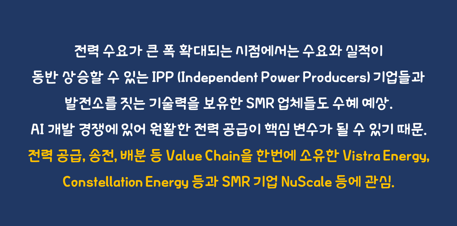 전력 수요가 큰 폭 확대되는 시점에서는 수요와 실적이 동반 상승할 수 있는 IPP (Independent Power Producers) 기업들과 발전소를 짓는 기술력을 보유한 SMR 업체들도 수혜 예상. 이들 기업이 테크 섹터와 어깨를 나란히 할 수 있는 AI 수혜주로서 밸류에이션 프리미엄을 부여 받을 수 있는 이유는 생성형 AI 개발 경쟁에 있어 원활한 전력 공급이 핵심 변수가 될 수 있기 때문. 빅테크 기업들은 신속하고 안정적인 전력을 공급받기 위해 전력 기업들과 직접 계약을 앞다퉈 진행 중. 헤지펀드들의 하반기를 겨냥한 종목 편출입 Top 10을 보면 AI 인프라 중심의 종목 비중은 줄이고 오히려 전력 기업들의 종목을 새로 편입하거나 늘리는 모습. 3~5년 장기 EPS 전망치 증가율은 가파르게 상승 중. 전력 공급, 송전, 배분 등 Value Chain을 한번에 소유한 Vistra Energy, Constellation Energy 등과 SMR 기업 NuScale 등에 관심.