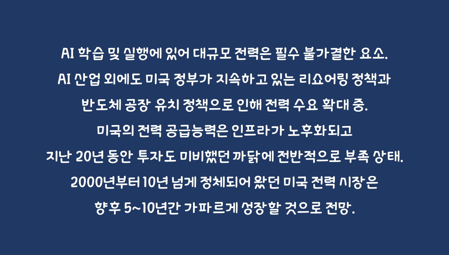 AI 시대에 진입하면서 전력 시장의 수요 패러다임 전환. 대량의 데이터를 요구하는 AI 학습 및 실행에 있어 대규모 전력은 필수 불가결한 요소. AI 산업 외에도 미국 정부가 지속하고 있는 리쇼어링 정책과 반도체 공장 유치 정책으로 인해 전력 수요 확대 중. 미국의 전력 공급능력은 인프라가 노후화되고 지난 20년 동안 투자도 미비했던 까닭에 전반적으로 부족 상태. 2024년 5월 FERC(연방에너지규제위원회)는 이러한 전력 부족 현상을 감안하여 미국 송전망을 5배 확대하기 위한 전력망 개혁 방안을 발표. 2000년부터 10년 넘게 정체되어 왔던 미국 전력 시장은 향후 5~10년간 가파르게 성장할 것으로 전망.