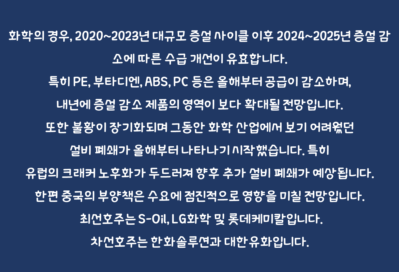 화학의 경우, 2020~2023년 대규모 증설 사이클 이후 2024~2025년 증설 감소에 따른 수급 개선이 유효합니다. 특히 PE, 부타디엔, ABS, PC 등은 올해부터 공급이 감소하며, 내년에 증설 감소 제품의 영역이 보다 확대될 전망입니다. 또한 불황이 장기화되며 그동안 화학 산업에서 보기 어려웠던 설비 폐쇄가 올해부터 나타나기 시작했습니다. 특히 유럽의 크래커 노후화가 두드러져 향후 추가 설비 폐쇄가 예상됩니다. 한편 중국의 부양책은 수요에 점진적으로 영향을 미칠 전망입니다.