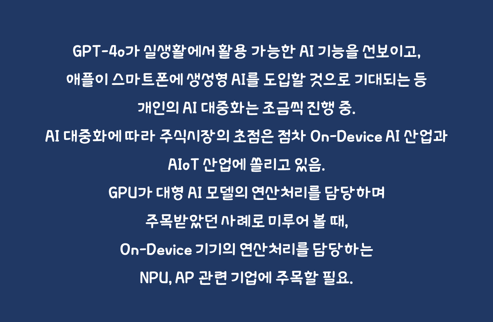 개인의 AI 사용에 있어서는 AI 모델의 성능보다는 AI의 실용성과 사용자 친화성(User-Friendly)이 중요. GPT-4o가 실생활에서 활용 가능한 AI 기능을 선보이고, 애플이 스마트폰에 생성형 AI를 도입할 것으로 기대되는 등 개인의 AI 대중화는 조금씩 진행 중. AI 대중화에 따라 주식시장의 초점은 점차 On-Device AI 산업과 AIoT 산업에 쏠리고 있음. GPU가 대형 AI 모델의 연산처리를 담당하며 주목받았던 사례로 미루어 볼 때, On-Device 기기의 연산처리를 담당하는 NPU, AP 관련 기업에 주목할 필요.