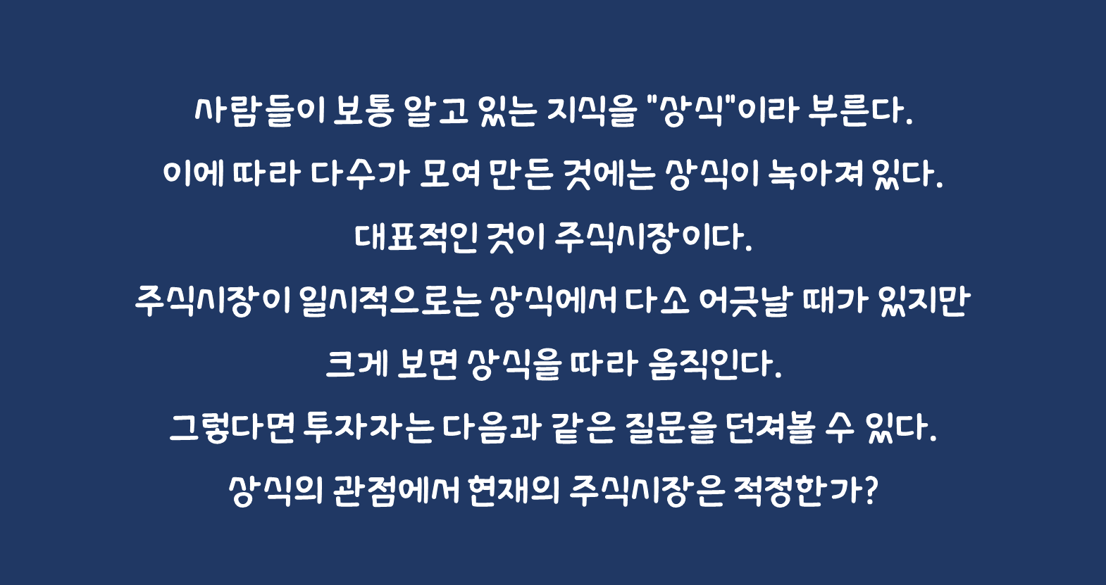 사람들이 보통 알고 있는 지식을 "상식"이라 부른다. 이에 따라 다수가 모여 만든 것에는 상식이 녹아져 있다. 대표적인 것이 주식시장이다. 주식시장이 일시적으로는 상식에서 다소 어긋날 때가 있지만 크게 보면 상식을 따라 움직인다. 그렇다면 투자자는 다음과 같은 질문을 던져볼 수 있다. 상식의 관점에서 현재의 주식시장은 적정한가? 아쉽게도 필자는 이에 대하여 쉽게 Yes라는 답을 하지 못할 것 같다. 이를 가장 상식적으로 설명해 보도록 하겠다.