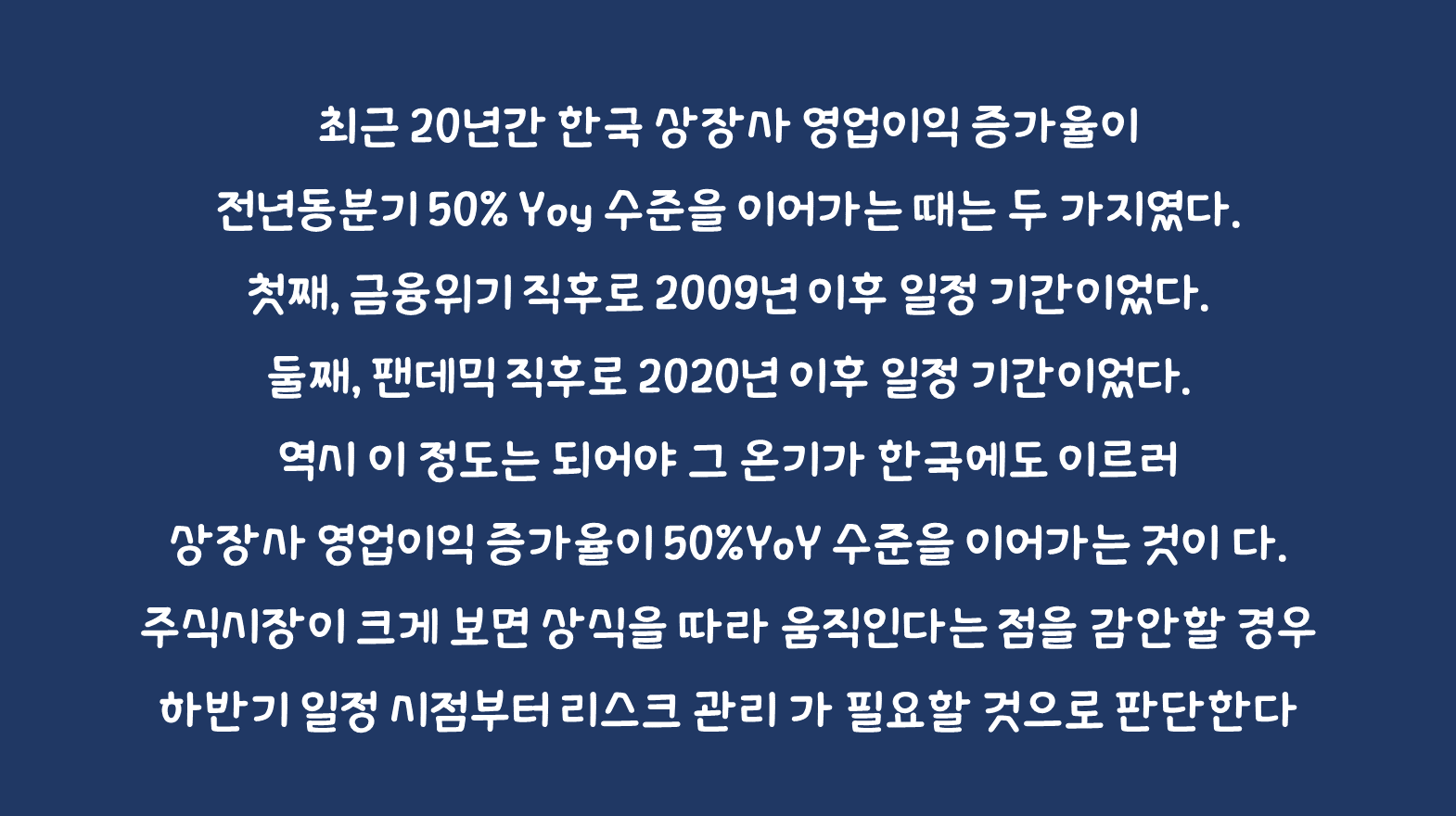 당연한 말이지만 요즘의 상황은 앞서 소개한 금융위기 직후 및 팬데믹 직후 두 시기와 같지 않다. 그렇다면 올해 남은 기간인 2분기부터 4분기까지 한국 상장사 영업이익 증가율이 전년동분기 50%Yo 수준을 이어간다는 것은 상식적일까? 만약 이러한 컨센서스가 주식시장에 녹아져 있다면 적정주가는 지금보다 높아야 할까? 낮아야 할까? 주식시장이 크게 보면 상식을 따라 움직인다는 점을 감안할 경우 하반기 일정 시점부터 리스크 관리 가 필요할 것으로 판단한다.