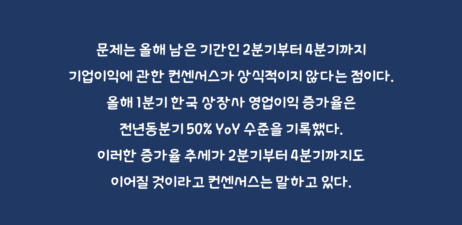 문제는 올해 남은 기간인 2분기부터 4분기까지 기업이익에 관한 컨센서스가 상식적이지 않다는 점이다. 올해 1분기 한국 상장사 영업이익 증가율은 전년동분기 50% YoY 수준을 기록했다. 이러한 증가율 추세가 2분기부터 4분기까지도 이어질 것이라고 컨센서스는 말하고 있다.