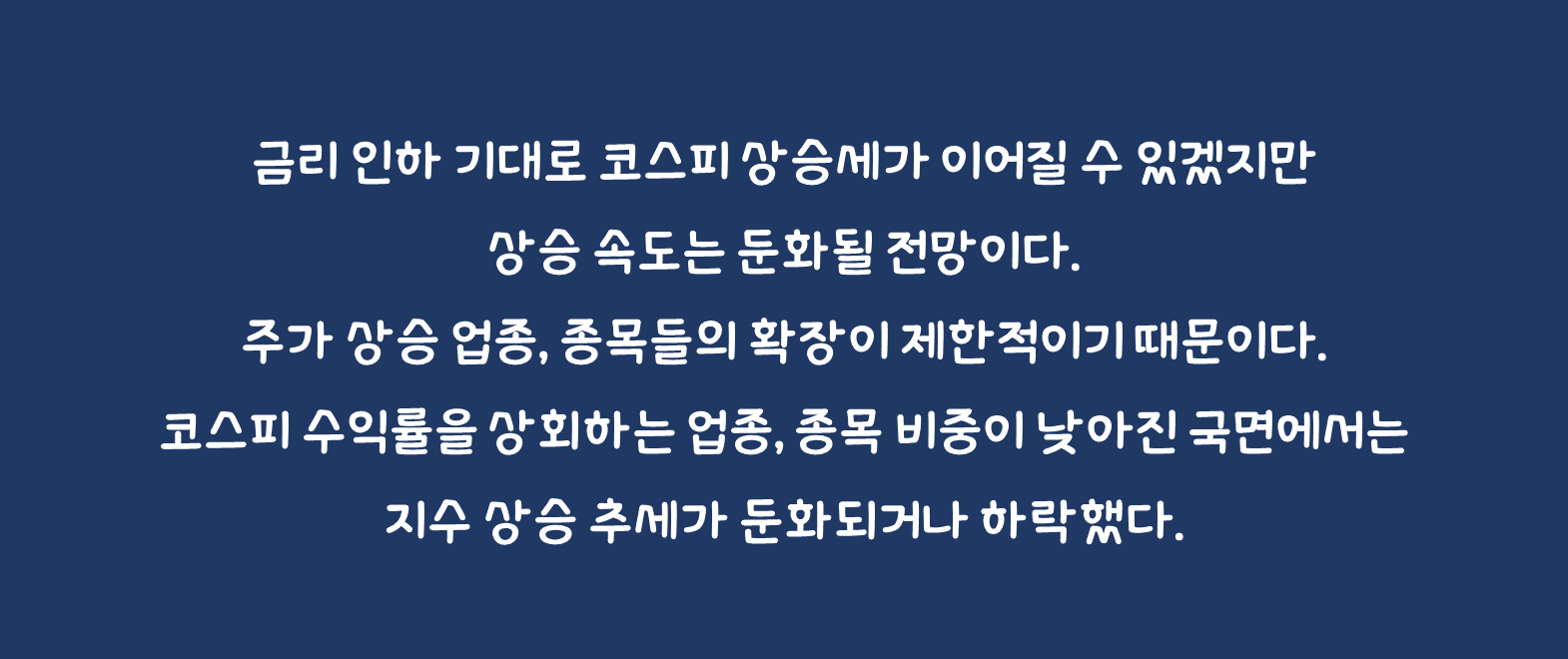 금리 인하 기대로 코스피 상승세가 이어질 수 있겠지만 상승 속도는 둔화될 전망이다. 주가 상승 업종, 종목들의 확장이 제한적이기 때문이다. 코스피 수익률을 상회하는 업종, 종목 비중이 낮아진 국면에서는 지수 상승 추세가 둔화되거나 하락했다.