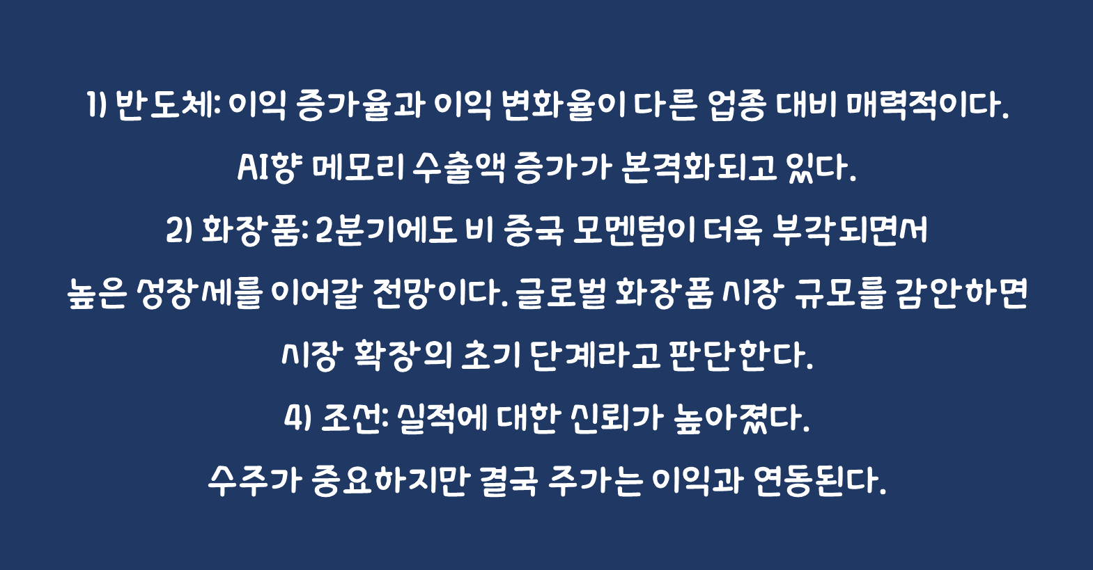 1) 반도체: 이익 증가율과 이익 변화율이 다른 업종 대비 매력적이다. AI향 메모리 수출액 증가가 본격화되고 있다. 메모리 현물가격 반등 가능성이 높은 점도 센티먼트에 긍정적이다. 반도체가 전체 영업이익에서 차지하는 비중은 1분기 17%, 2분기 22%에서 4분기에는 29%까지 높아질 것으로 예상된다.