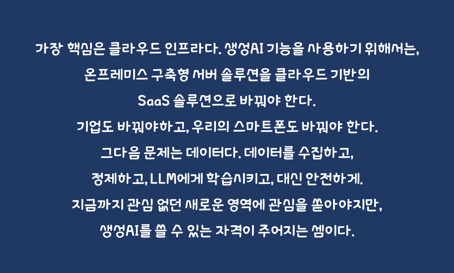 가장 핵심은 클라우드 인프라다. 생성AI 기능을 사용하기 위해서는, 온프레미스 구축형 서버 솔루션을 클라우드 기반의 SaaS 솔루션으로 바꿔야 한다. 기업도 바꿔야하고, 우리의 스마트폰도 바꿔야 한다.