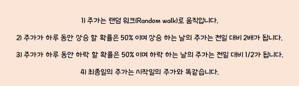 위의 마지막 4번째 조건의 의미는 이 주식을 장기 투자한 투자자는 최종일에 수익률이 0%가 된다는 의미입니다.