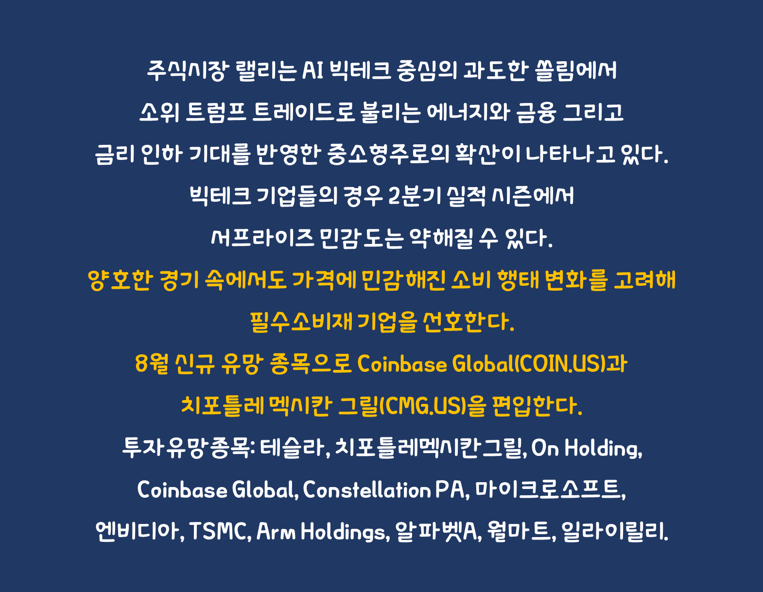정치의 계절이다. G1 미국의 대통령 선거 레이스에서 후보자 피격과 상대 후보의 교체, 실적을 무력화시키는 발언들까지 주가에 대한 영향력이 커졌다. 주식시장 랠리는 AI 빅테크 중심의 과도한 쏠림에서 소위 트럼프 트레이드로 불리는 에너지와 금융 그리고 금리 인하 기대를 반영한 중소형주로의 확산이 나타나고 있다. 물가와 금리 방향성에 컨센서스가 모아진 상황에서 투자자의 관심은 이제 실적으로 향한다. 빅테크 기업들의 경우 2분기 실적 시즌에서 서프라이즈 민감도는 약해질 수 있다. 양호한 경기 속에서도 가격에 민감해진 소비 행태 변화를 고려해 필수소비재 기업을 선호한다. 금리 인하와 대선 후보 정책 관련 수혜주는 실적 영향을 점검할 필요가 있다. 8월 신규 유망 종목으로 Coinbase Global(COIN.US)과 치포틀레 멕시칸 그릴(CMG.US)을 편입한다.
