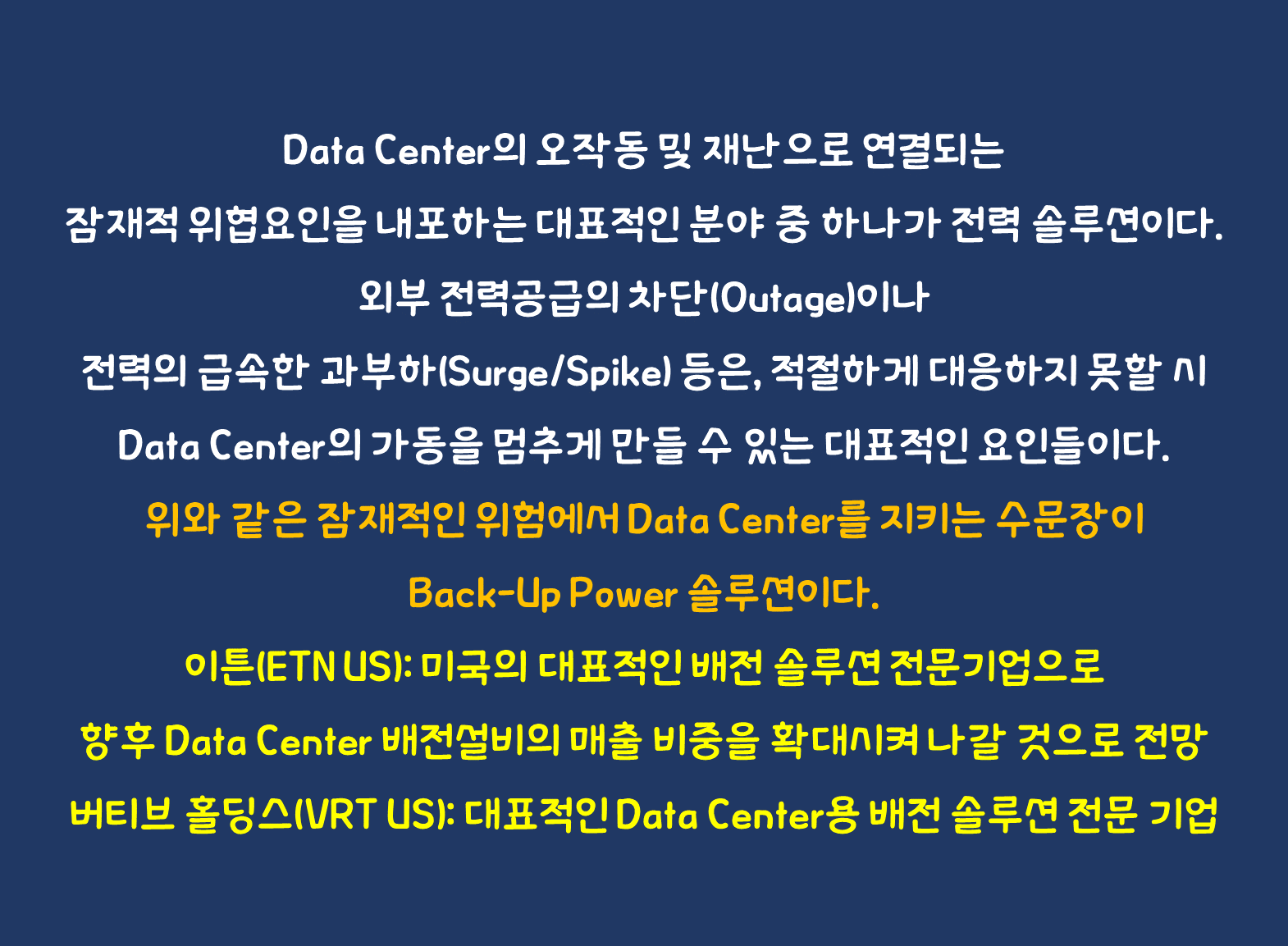 Data Center의 오작동 및 재난으로 연결되는 잠재적 위협요인을 내포하는 대표적인 분야 중 하나가 전력 솔루션이다. 외부 전력공급의 차단(Outage)이나 전력의 급속한 과부하(Surge/Spike) 등은, 적절하게 대응하지 못할 시 Data Center의 가동을 멈추게 만들 수 있는 대표적인 요인들이다. 전력의 비정상적인 공급은 일시적인 Data Center의 가동 중단을 넘어 화재 등 대규모 재난으로 이어질 수도 있다는 짐도 중요한 포인트다.
