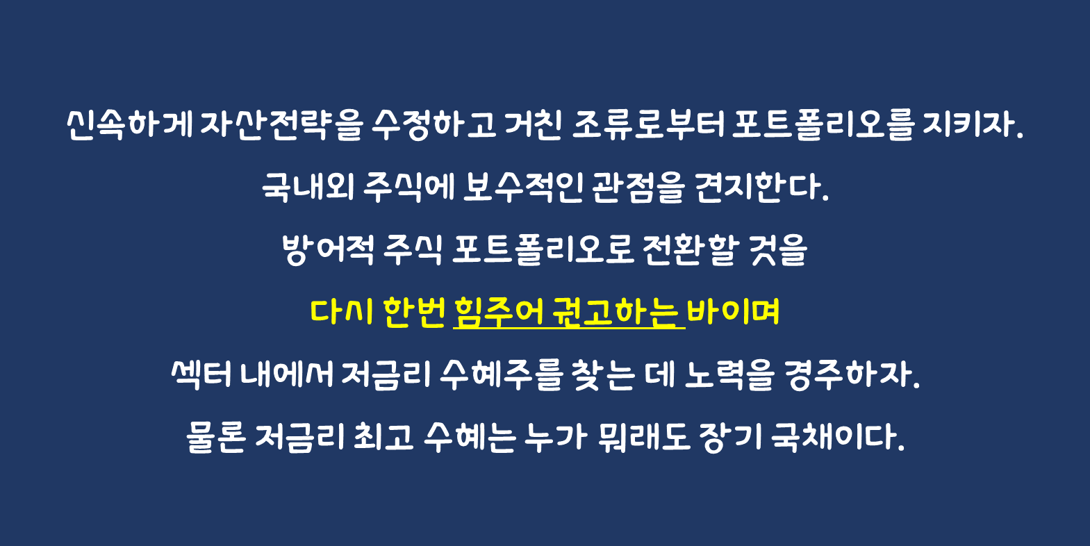신속하게 자산전략을 수정하고 거친 조류로부터 포트폴리오를 지키자. 국내외 주식에 보수적인 관점을 견지한다. 방어적 주식 포트폴리오로 전환할 것을 다시 한번 힘주어 권고하는 바이며 섹터 내에서 저금리 수혜주를 찾는 데 노력을 경주하자. 물론 저금리 최고 수혜는 누가 뭐래도 장기 국채이다. 당분간 관세 우려와 한국의 내수 부진, 수출 성장세 둔화 등으로 달러/원 환율이 높은 상태를 유지할 것으로 예상되므로 달러 장기국채에 비중을 더하자. 크레딧 채권은 발행이 줄어드는 8월까지는 스프레드 변화가 적을 것이나 9월 이후 발행증가와 함께 상대가치가 회복할 것을 예상한다. 중국은 펀더멘털 부진이 이어져서 눈높이는 이미 낮아져 있다. 중국 밸류업 수혜주 등의 특정 테마 중심의 매매는 여전히 유효하다.