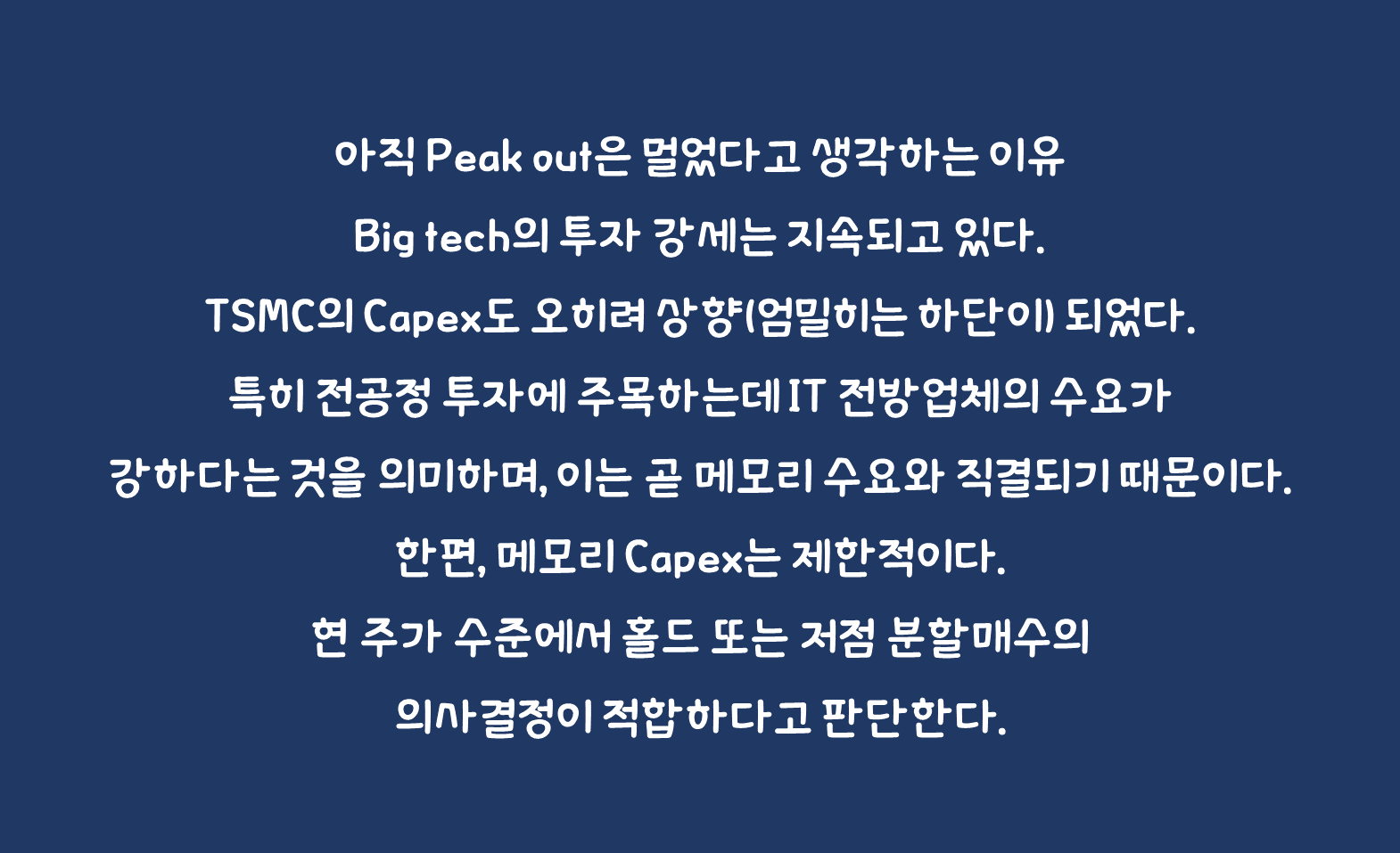 현 시점 삼성전자, SK하이닉스를 비롯한 국내 칩메이커와 NVDA의 급락에 대해 뒤늦은 비중 축소 보다는 업황의 견조함이 확인되는 순간까지 홀드 또는 매수관점 접근하는 것이 적합하다고 판단한다.