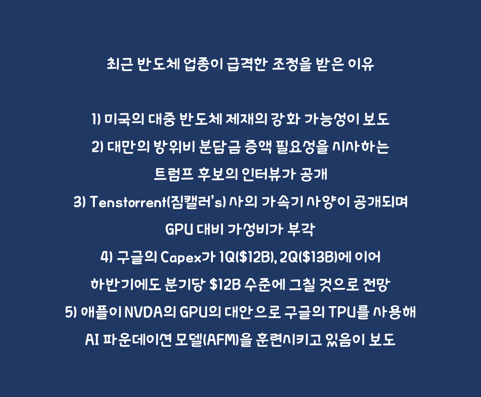 상기 전반적으로 NVDA 위주 AI 업종의 센티먼트를 위축시킬만한 이슈들이지만, 아직까지 실수요 영향에 구체화되지 않았으며, 우려에 가까운 내용들이다.