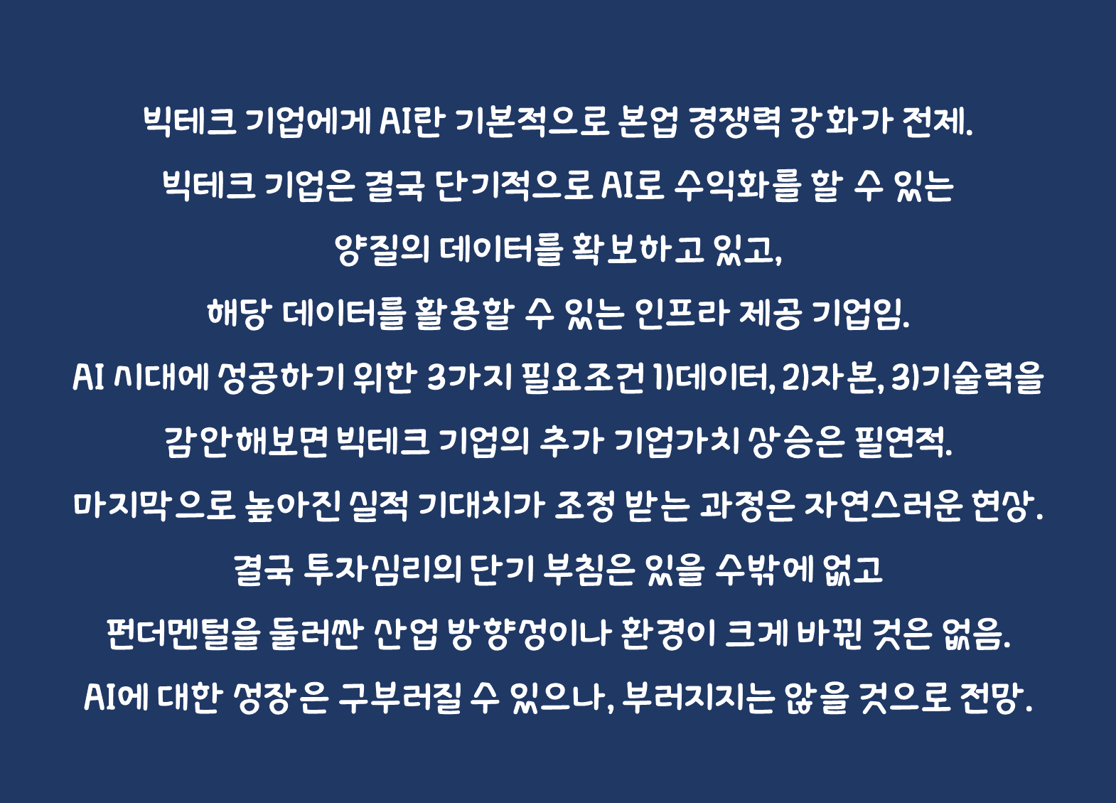 부분적으로 일리가 있는 이야기지만, 전적으로 동의하기는 어려움. Open AI가 무너지면 투자심리가 소강 상태에 빠질 수도 있겠지만, Open AI가 안된다고 AI에 대한 투자가 줄거나 성장이 멈추는 것과는 별개의 이야기. 빅테크 기업에게 AI란 기본적으로 본업 경쟁력 강화가 전제. 구글, 마이크로소프트, 아마존은 클라우드에서 AI를 활용하고 있고, 메타도 Gen AI 이전부터 이미 알고리즘과 타겟팅 광고에 AI를 접목하고 있었음. 또한 AI 상용화는 B2C보다는 B2B가 먼저. B2C향 AI 에이전트 서비스의 경우 데이터, 보안, 완성도, 신뢰도 측면에서 시장에 자리잡기까지 최소 2년은 걸릴 것. 빅테크 기업은 결국 단기적으로 AI로 수익화를 할 수 있는 양질의 데이터를 확보하고 있고, 해당 데이터를 활용할 수 있는 인프라 제공 기업임. AI 시대에 성공하기 위한 3가지 필요조건 1)데이터, 2)자본, 3)기술력을 감안해보면 빅테크 기업의 추가 기업가치 상승은 필연적.