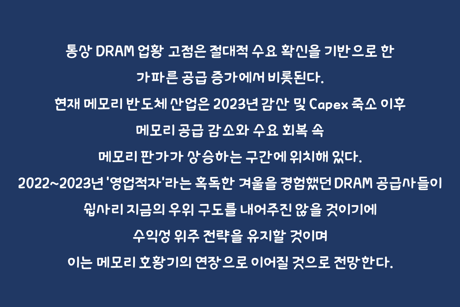 통상 DRAM 업황 고점은 절대적 수요 확신을 기반으로 한 가파른 공급 증가에서 비롯된다. 현재 메모리 반도체 산업은 2023년 감산 및 Capex 죽소 이후 메모리 공급 감소와 수요 회복 속 메모리 판가가 상승하는 구간에 위치해 있다. 일반적인 메모리 사이클은 지금과 같은 상황에서 판가 상승 (=업황 회복)과 함께 공급사들이 공급을 급격히 늘리지만 수요는 감소해 업황은 겨울로 진입하는 식으로 진행되곤 했다. 그러나 2022~2023년 '영업적자'라는 혹독한 겨울을 경험했던 DRAM 공급사들이 쉽사리 지금의 우위 구도를 내어주진 않을 것이기에 수익성 위주 전략을 유지할 것이며 이는 메모리 호황기의 연장으로 이어질 것으로 전망한다.