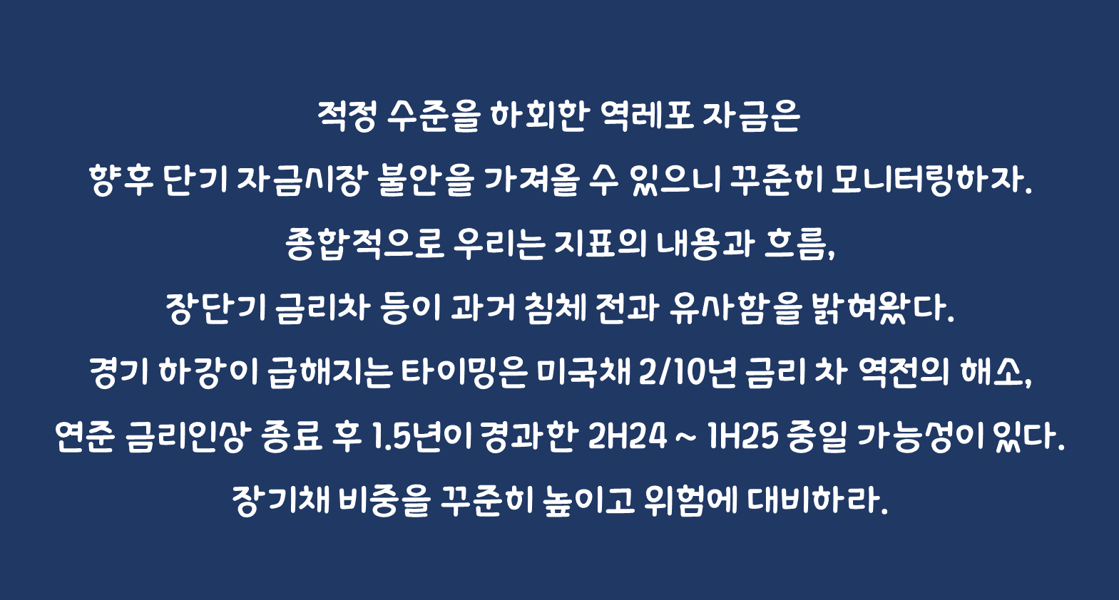 금리인하전망 강화로 T-Bill로 자금이 쏠리고 역레포가 유동성으로 출회되고 있다. 금융시장을 안정시키는 요소다. 그러나 역레포 특성상, 지준과 유사하게 최소 유지규모가 $4천억 이어야 한다고 생각한다. 적정 수준을 하회한 역레포 자금은 향후 단기 자금시장 불안을 가져올 수 있으니 꾸준히 모니터링하자. 종합적으로 우리는 지표의 내용과 흐름, 장단기 금리차 등이 과거 침체 전과 유사함을 밝혀왔다. 경기 하강이 급해지는 타이밍은 미국채 2/10년 금리 차 역전의 해소, 연준 금리인상 종료 후 1.5년이 경과한 2H24 ~ 1H25 중일 가능성이 있다. 장기채 비중을 꾸준히 높이고 위험에 대비하라. 단기적으로 시장이 안정된 것처럼 보이지만 '엔 숏 페어 트레이드'라는 성냥불이 꺼져가는 것이며 임계상태에 비유되는 휘발유 통은 여전히 건재하다. 또 다른 성냥불이 던져지면 언제 폭발해도 이상하지 않다. 휘발유를 보지 못한 채 성냥로 폭발을 설명하려는 우를 범하지 말라. 휘발유란 경기의 하강, 현실을 반영 못하는 물가와 고용, 펀더멘털 대비 말도 안 되게 높은 금리다. 중앙은행이 금리 인하를 연기시키거나 현 상황을 금융시장의 치기 어린 발작으로 여긴다면 더더욱 대규모의 채권 롱포지션을 쌓아라.