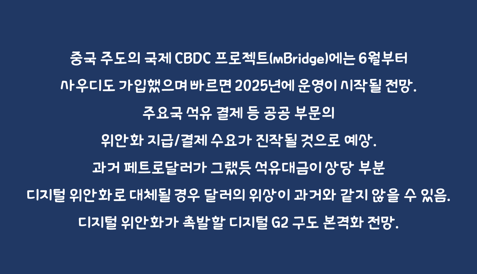 CBDC의 연구/개발 선두는 단연 중국. 과거 위안화의 키워드가 ‘국제화’였다면 향후에는 ‘디지털’이 핵심. 중국 주도의 국제 CBDC 프로젝트(mBridge)에는 6월부터 사우디도 가입했으며 빠르면 2025년에 운영이 시작될 전망. 주요국 석유 결제 등 공공 부문의 위안화 지급/결제 수요가 진작될 것으로 예상. 과거 페트로달러가 그랬듯 석유대금이 상당 부분 디지털 위안화로 대체될 경우 달러의 위상이 과거와 같지 않을 수 있음. SWIFT 대비 거래 비용이 적고 결제일 축소 등 편의성이 높아 여타국 참여 유인도 큼. 디지털 위안화가 촉발할 디지털 G2 구도 본격화 전망.