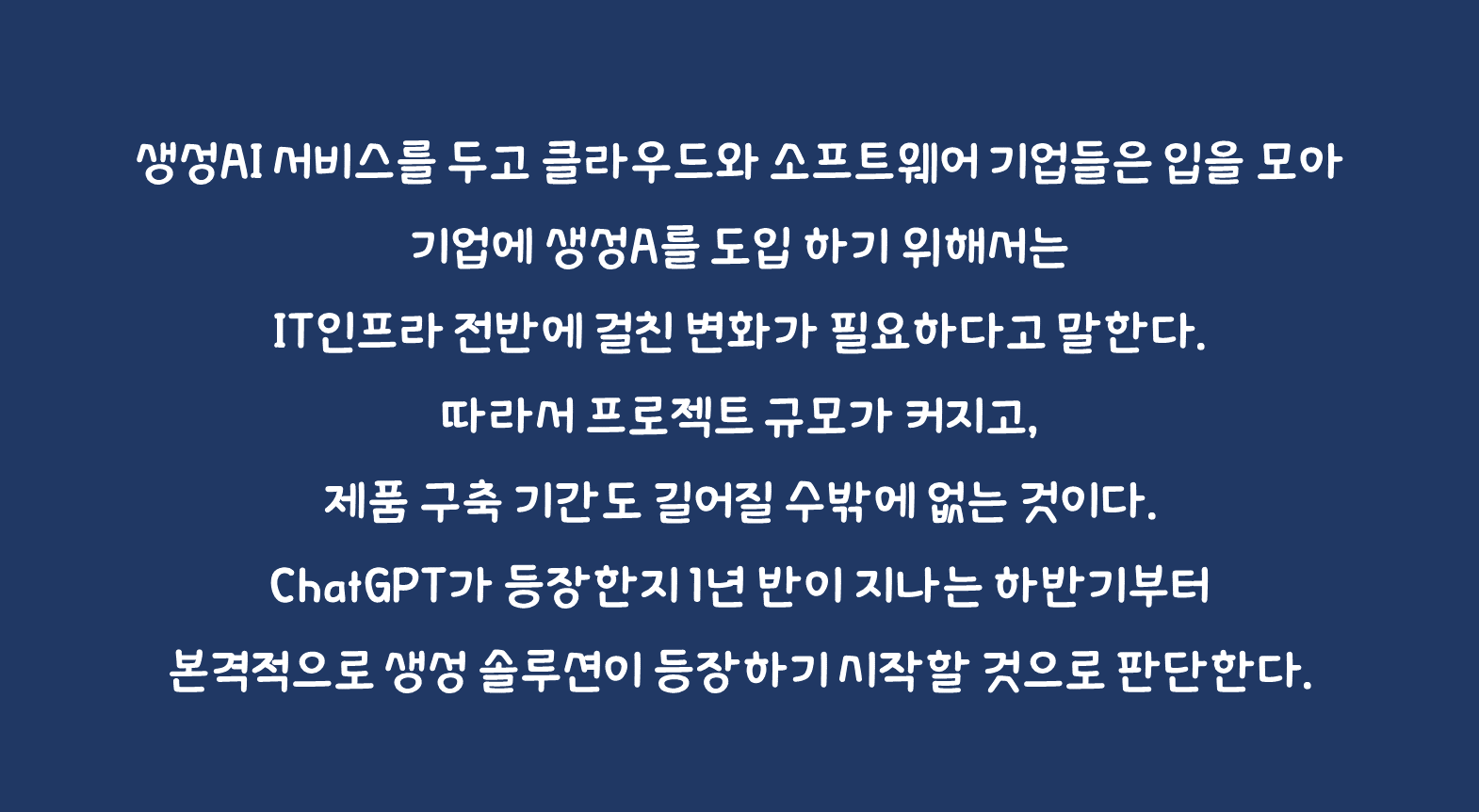 생성 AI 서비스를 두고 클라우드와 소프트웨어 기업들은 입을 모아 기업에 생성 AI를 도입하기 위해서는 IT인프라 전반에 걸친 변화가 필요하다고 말한다. 따라서 프로젝트 규모가 커지고, 제품 구축 기간도 길어질 수밖에 없는 것이다. ChatGPT가 등장한 지 1년 반이 지나는 하반기부터 본격적으로 생성 솔루션이 등장하기 시작할 것으로 판단한다.