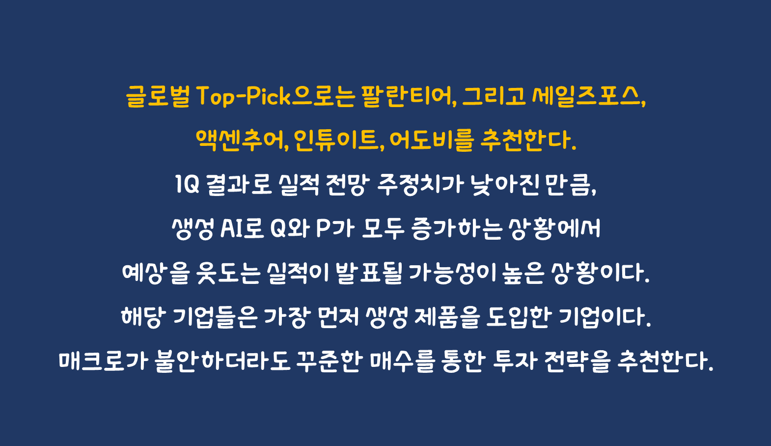 글로벌 Top-Pick으로는 팔란티어, 그리고 세일즈포스, 액센추어, 인튜이트, 어도비를 추천한다.