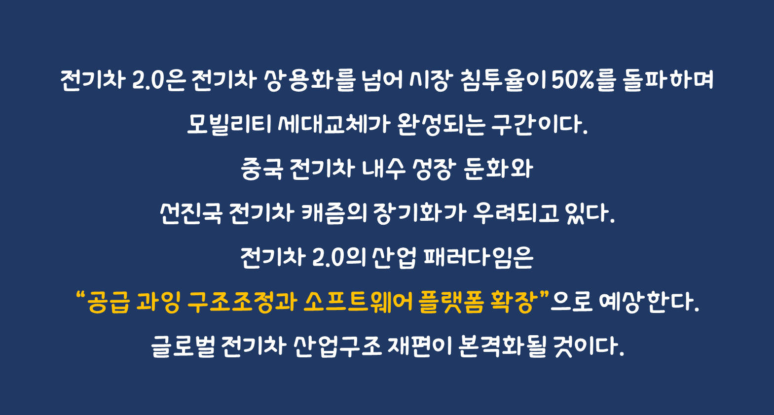 중국 전기차 산업이 2.0 단계로 진입하고 있다. 7월 중국 전기차 침투율은 처음으로 50%를 돌파하였다. 전기차 2.0은 전기차 상용화를 넘어 시장 침투율이 50%를 돌파하며 모빌리티 세대교체가 완성되는 구간이다. 중국 전기차 내수 성장 둔화와 선진국 전기차 캐즘의 장기화가 우려되고 있다. 전기차 2.0의 산업 패러다임은 “공급 과잉 구조조정과 소프트웨어 플랫폼 확장”으로 예상한다. 글로벌 전기차 산업구조 재편이 본격화될 것이다.