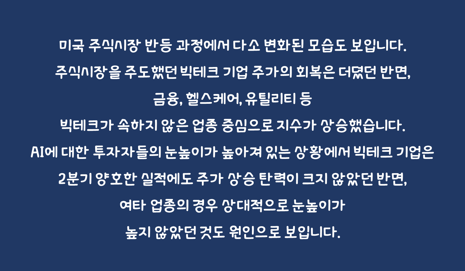 미국 주식시장 반등 과정에서 다소 변화된 모습도 보입니다. 주식시장을 주도했던 빅테크 기업 주가의 회복은 더뎠던 반면, 금융, 헬스케어, 유틸리티 등 빅테크가 속하지 않은 업종 중심으로 지수가 상승했습니다. AI에 대한 투자자들의 눈높이가 높아져 있는 상황에서 빅테크 기업은 2분기 양호한 실적에도 주가 상승 탄력이 크지 않았던 반면, 여타 업종의 경우 상대적으로 눈높이가 높지 않았던 것도 원인으로 보입니다.