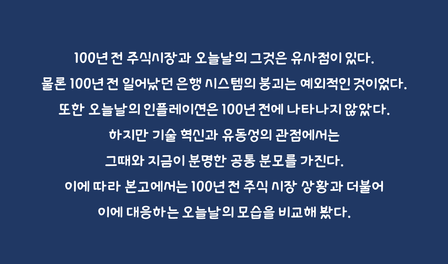 100년 전 주식시장과 오늘날의 그것은 유사점이 있다. 물론 100년 전 일어났던 은행 시스템의 붕괴는 예외적인 것이었다. 또한 오늘날의 인플레이션은 100년 전에 나타나지 않았다. 하지만 기술 혁신과 유동성의 관점에서는 그때와 지금이 분명한 공통 분모를 가진다. 이에 따라 본고에서는 100년 전 주식 시장 상황과 더불어 이에 대응하는 오늘날의 모습을 비교해 봤다. 100년 전은 러셀 내피어(Russel Napier)의 자료를 참고했으며 오늘날은 필자가 괄호 안에 그 내용을 정리했다. 이를 통하여 주식시장 이 향후 어떻게 흘러갈지 생각하는 시간을 가져보고자 한다.