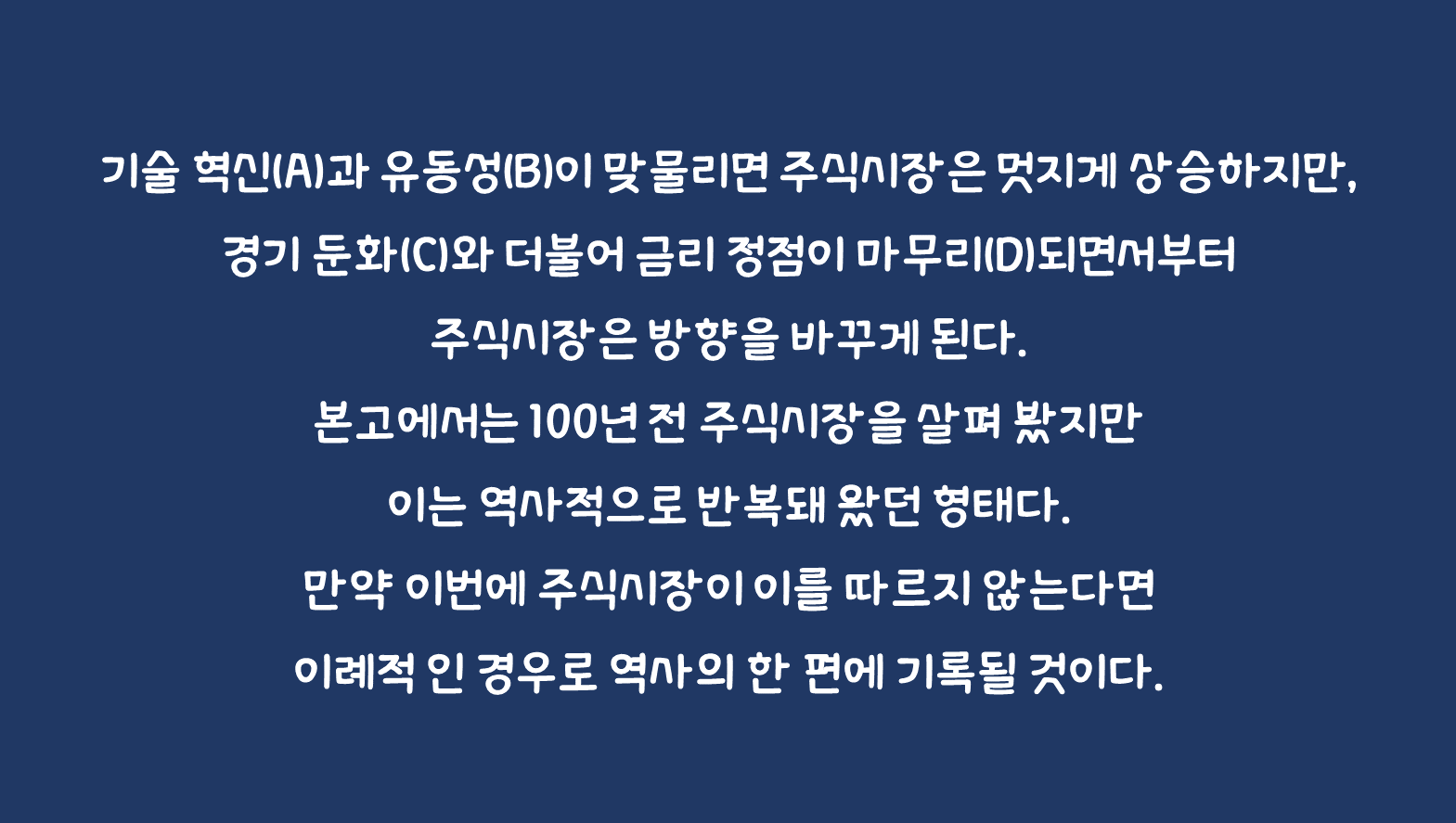 기술 혁신(A)과 유동성(B)이 맞물리면 주식시장은 멋지게 상승하지만, 경기 둔화(C)와 더불어 금리 정점이 마무리(D)되면서부터 주식시장은 방향을 바꾸게 된다. 본고에서는 100년 전 주식시장을 살펴 봤지만 이는 역사적으로 반복돼 왔던 형태다. 만약 이번에 주식시장이 이를 따르지 않는다면 이례적 인 경우로 역사의 한 편에 기록될 것이다.